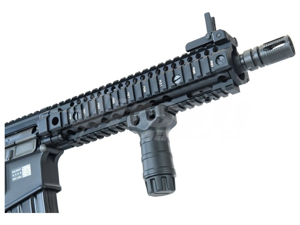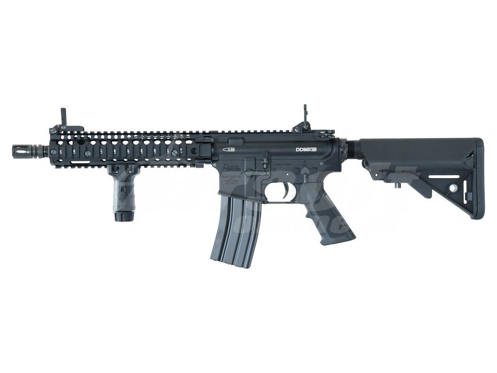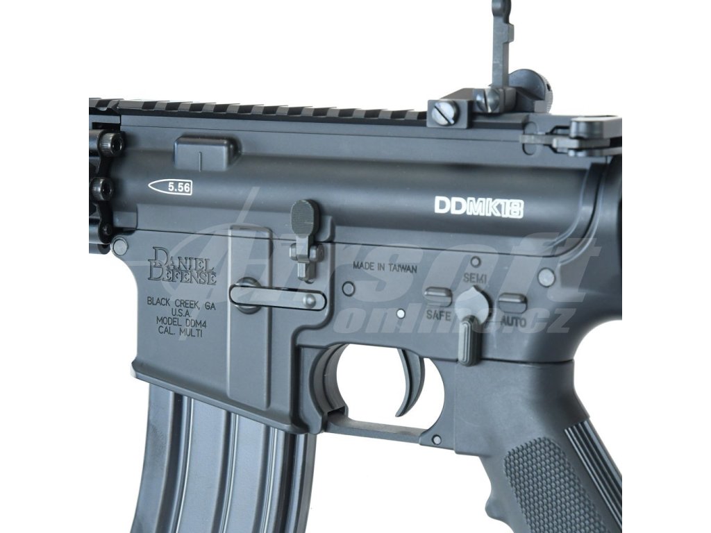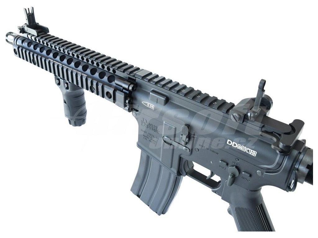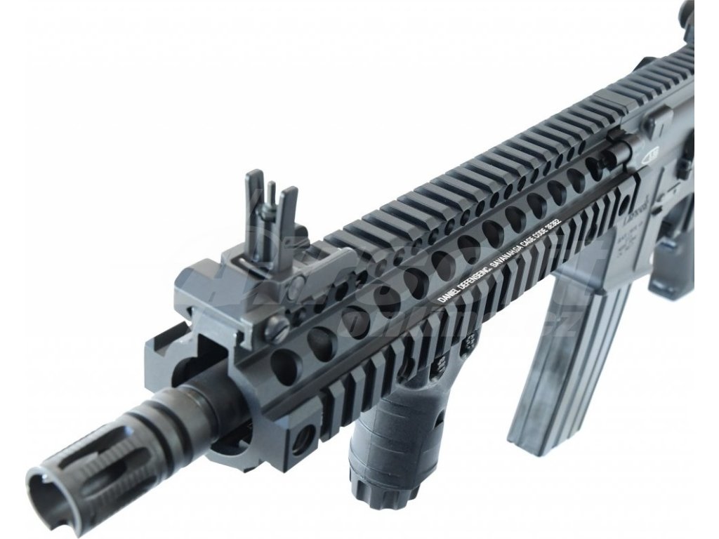 Tělo zbraně je celokovové s realistickým ražením a RIS předpažbím, které poskytuje široké možnosti montáže příslušenství. Nechybí plastový grip, odnímatelná RIS mířidla a kompaktní rozměry ideální pro dynamický boj na krátké vzdálenosti. Zbraň je navíc licencovaná firmou Daniel Defense, což podtrhuje její autentičnost.