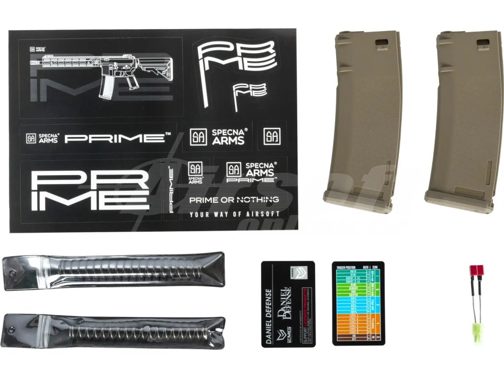 PRIME™ je nejvyšší řada airsoftových zbraní od společnosti Specna Arms. Jedná se o nejnovější sérii replik, které přinášejí to nejlepší, co současný trh nabízí. Zbraně z této řady se vyznačují kovovým tělem s technologií Nano Coating, která zvyšuje odolnost vůči poškození a poškrábání. Mezi další vylepšení patří bezkartáčové motory SA Dark Matter 27K, zcela přepracované mechaboxy ÆTHER, procesorové jednotky Gate Aster II Bluetooth a systém rychlé výměny pružiny ESA2. |