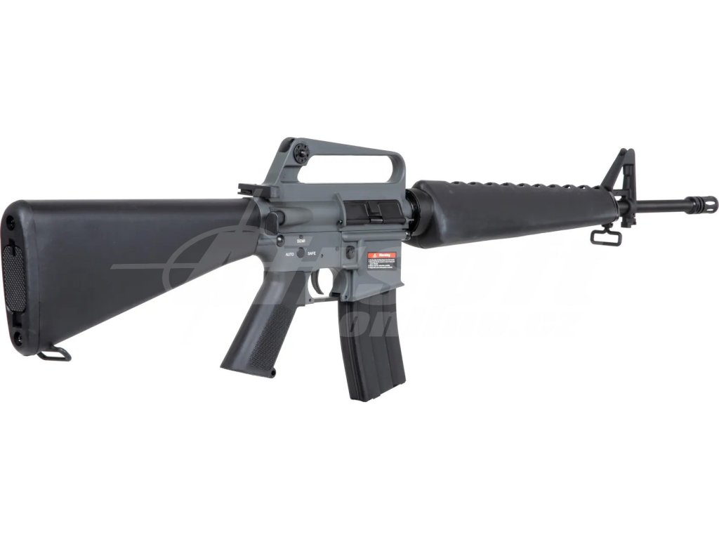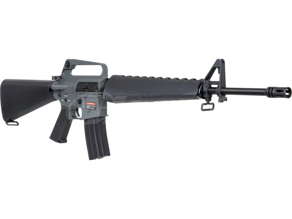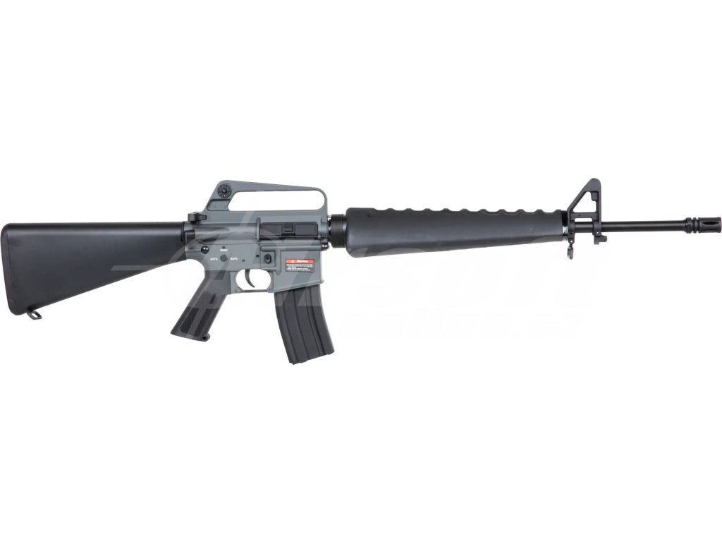 Replika je celokovová s věrně zpracovaným tělem, klasickým pevným předpažbím a pažbou charakteristickou pro pušku M16A2. Oproti moderním modelům nenajdete RIS lišty ani nastavitelné doplňky – vše je navrženo pro maximální věrnost předloze. Váha zbraně je 2,65 kg a její celková délka 980 mm. Vnitřní hlaveň o délce 500 mm v kombinaci s regulovatelným hop-upem přináší vynikající přesnost na dlouhé vzdálenosti.