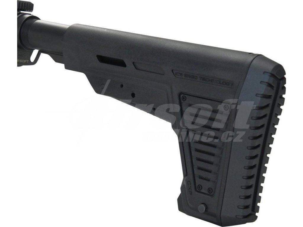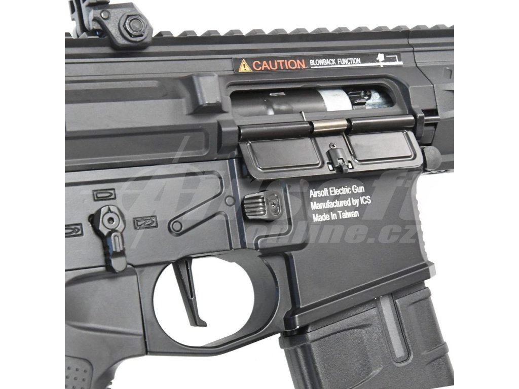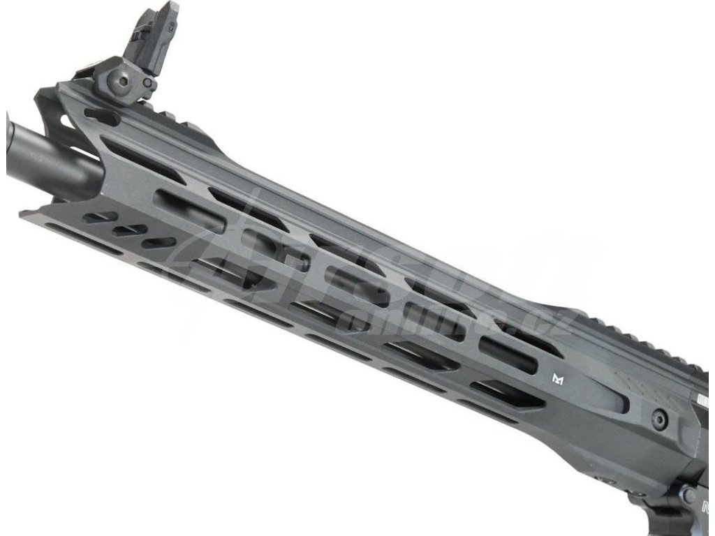 Tělo zbraně je kompletně vyrobeno z precizně obrobeného kovu, přičemž horní a dolní část těla i M-LOK předpažbí byly vytvořeny technologií CNC. RIS lišta je osazena sklopnými mířidly a celá zbraň je ergonomicky doladěna včetně ICS Ergo pažby, která nabízí velký prostor pro baterii i pohodlné nastavení délky. Ovládací prvky jsou navrženy pro praváky i leváky. Tlumič s odnímatelným zesilovačem hluku podtrhuje výrazný a taktický vzhled.