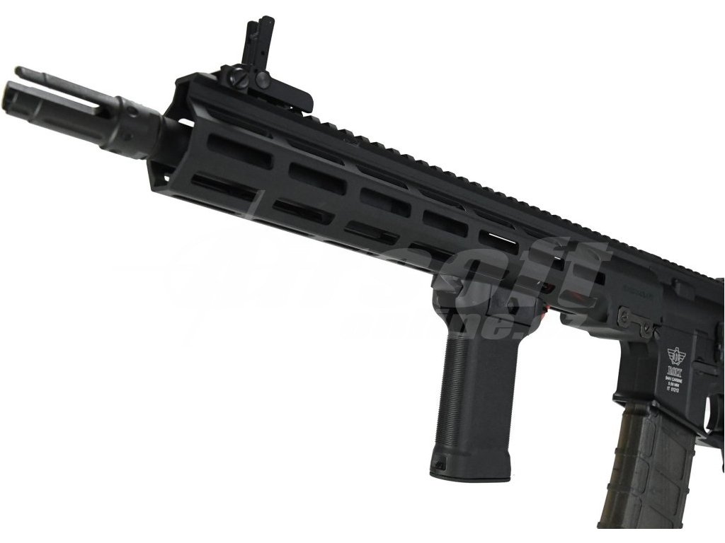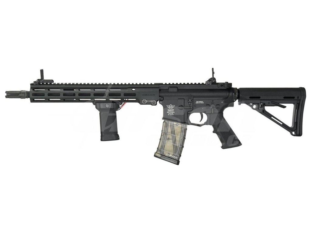 Samozřejmě, že vnější zpracování zůstává věrné Taiwanské kvalitě. Krásně zpracované celokovové tělo i plastové pažbení a kovové předpažbí s M-lok předpažbím. Nechybí odnímatelná mířidla a taktická rukojeťs prostorem pro baterii. Ke zbrani je přiložena Li-pol baterie 11,1V. Zajímavostí je i zásobník vyrobený z průhledného plastu.