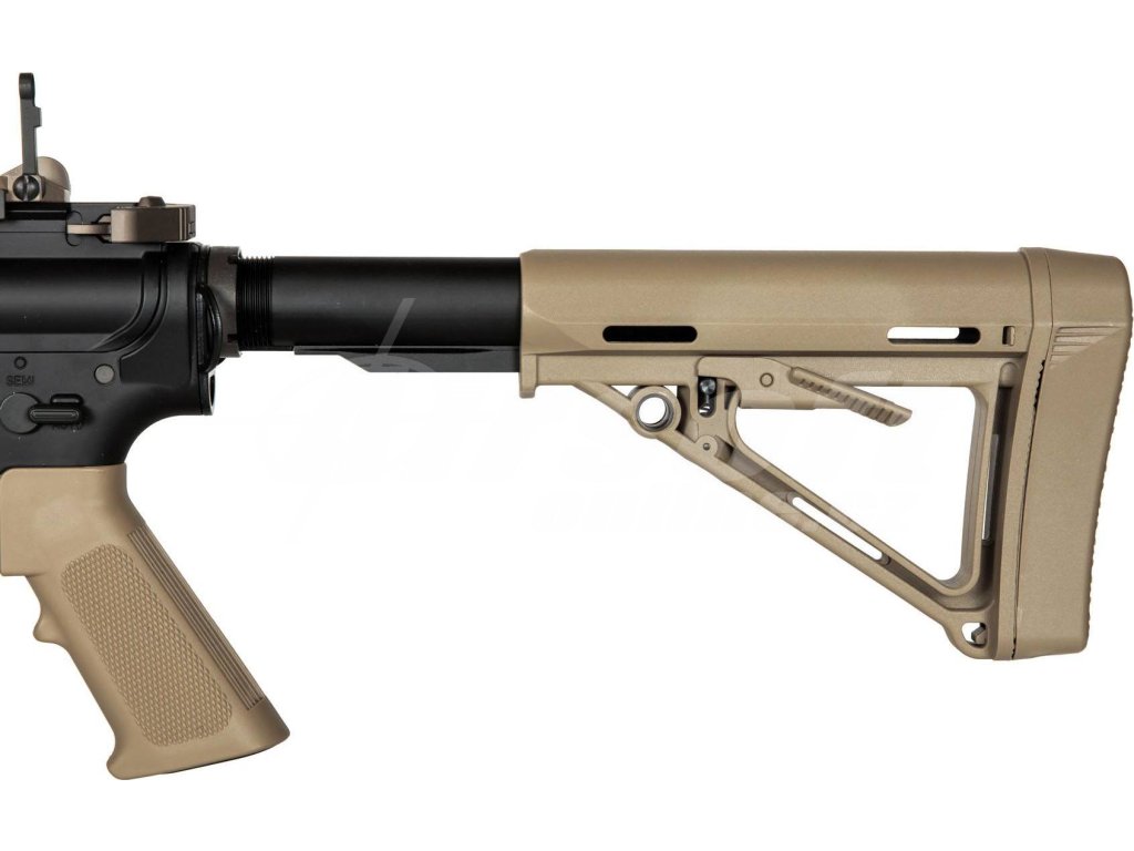 Tělo této celokovové airsoft zbraně je vyrobeno z hliníku a oceli, což zajišťuje maximální odolnost a stabilitu při zachování realistického vzhledu. Všechny díly perfektně lícují – žádná vůle ani kompromisy. Zbraň je osazena teleskopickou pažbou BOM Stock s QD montáží a úložným prostorem. Předpažbí využívá M-LOK rozhraní a na horní straně najdeme RIS lištu 22 mm s kovovými mířidly. O kvalitní zvukový i optický dojem se stará tlumič výšlehu Firehog.