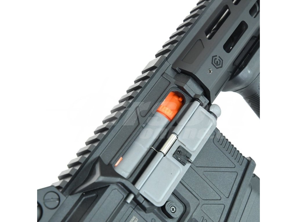 Zbraň je vybavena moderní procesorovou jednotkou (ETU), která zahrnuje elektromagnetickou spoušť, aktivní brzdu a kontrolu cyklu. Tato jednotka zajišťuje okamžitou odezvu, precizní dávkování střelby a chrání vnitřní komponenty před nadměrným opotřebením. Díky tomu je zbraň připravena i na intenzivní herní nasazení.
