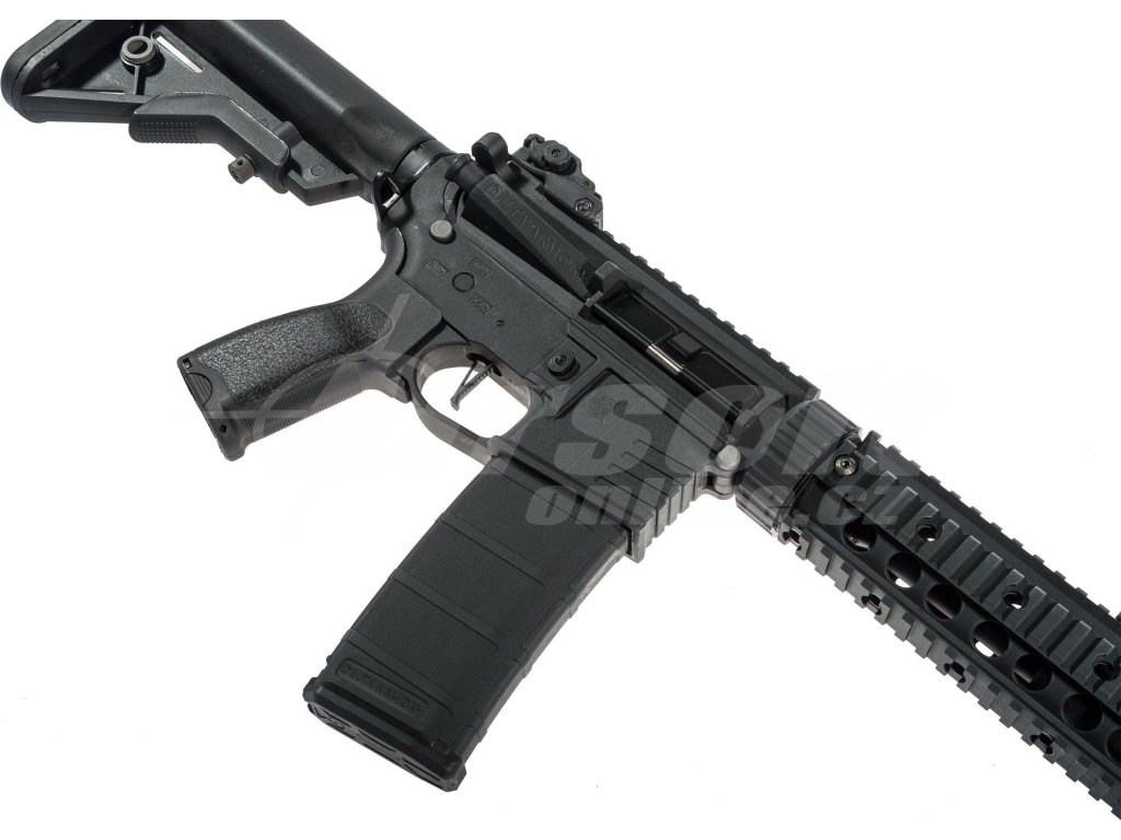 Tato zbraň je postavena na robustním polymerovém těle s kovovými detaily, které zajišťují nízkou hmotnost a zároveň odolnost při nasazení. RIS předpažbí a výsuvná pažba poskytují skvělou ergonomii a možnosti přizpůsobení. Hlaveň ukončená 14 mm levotočivým závitem je osazena tlumičem hluku s reálnou tlumicí pěnou, což dotváří její taktický vzhled.