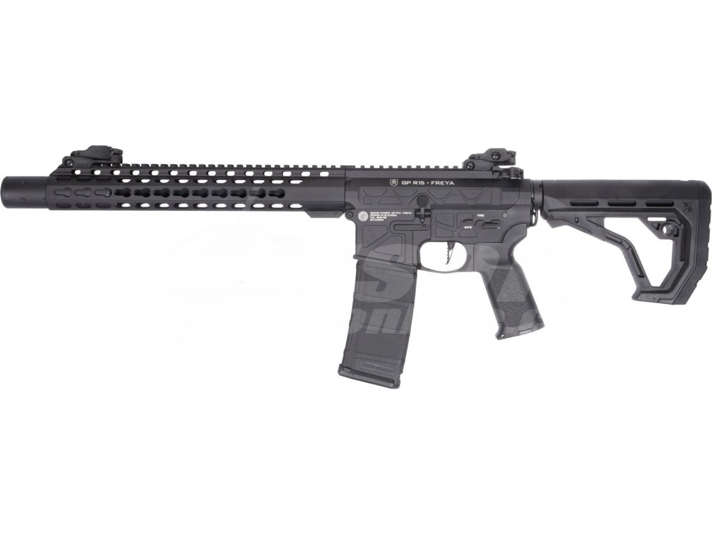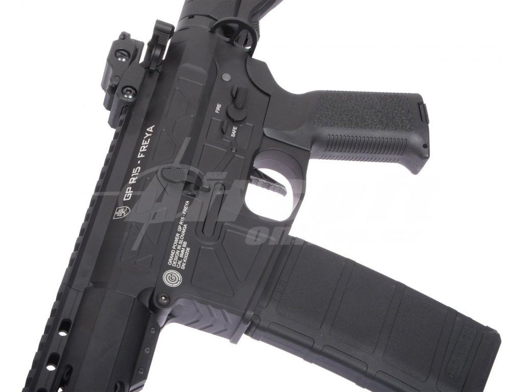 Model FREYA R15 je licencovanou replikou slovenského výrobce Grand Power, známého pro inovativní přístup k vývoji zbraní. Design vychází z platformy AR15/M4, ale s unikátními rysy, navrženými s důrazem na ergonomii a taktické použití v prostředí ozbrojených sil i sportovní střelby. Varianta SilentOps posouvá koncept DMR karabiny ještě dál díky prodloužené hlavni a integraci tlumiče.