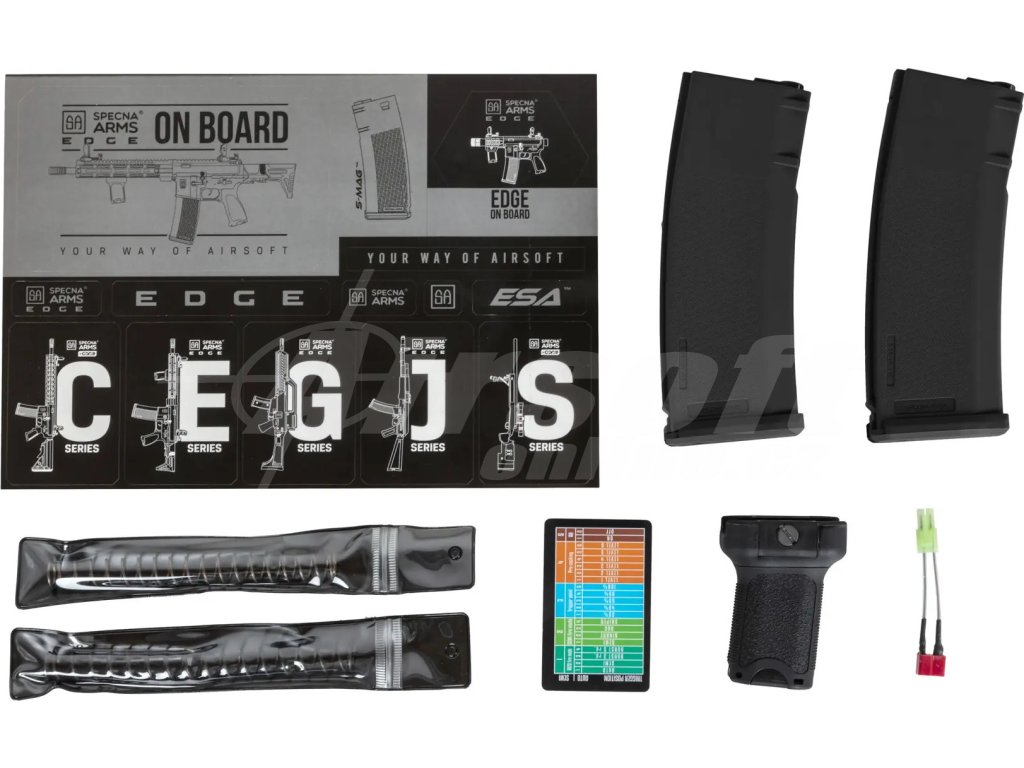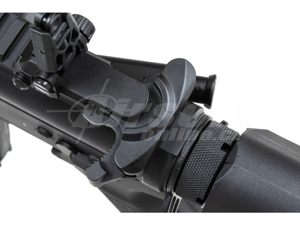 Uvnitř najdeme CNC ocelová kola 16:1, ocelový válec, hliníkovou trysku i hlavu válce, polymerový píst s celokovovým ozubením, a 8mm kuličková a kluzná ložiska. Sklopná mířidla, RIS montáže a 14mm levotočivý závit umožňují snadnou instalaci příslušenství. Zbraň podporuje akumulátory typu Li-Po 7,4V až 11,1V a střílí s energií až 1,32 J, rychlostí 377 fps (cca 115 m/s).