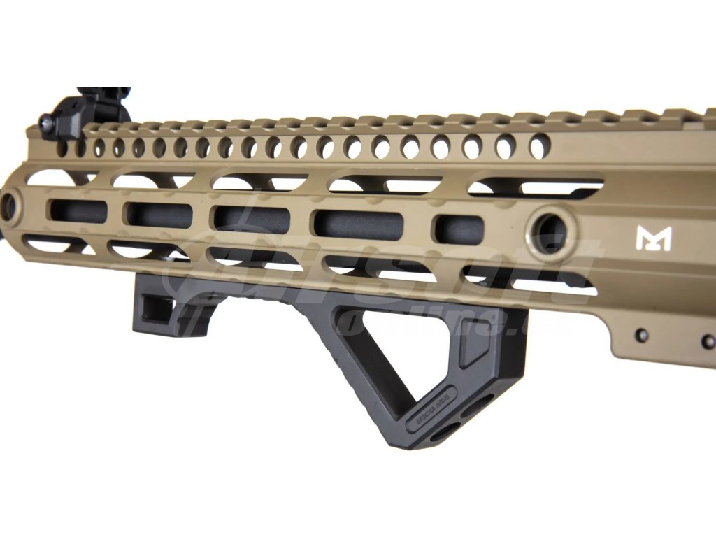 Tělo zbraně je kompletně celokovové, ošetřené povrchovou úpravou Nano Coating, která chrání proti škrábancům a opotřebení. V ruce působí robustně, ale stále ergonomicky – díky texturované pistolové rukojeti QD máte rychlý přístup k motoru bez potřeby nářadí. Zadní část tvoří pohodlná výsuvná pažba, do které lze snadno vložit baterii typu Stick. Na vrchní i boční části předpažbí je 22mm RIS/M-LOK lišta, která umožní snadné připojení dalšího příslušenství jako svítilna, kolimátor, AN/PEQ box nebo rukojeť.