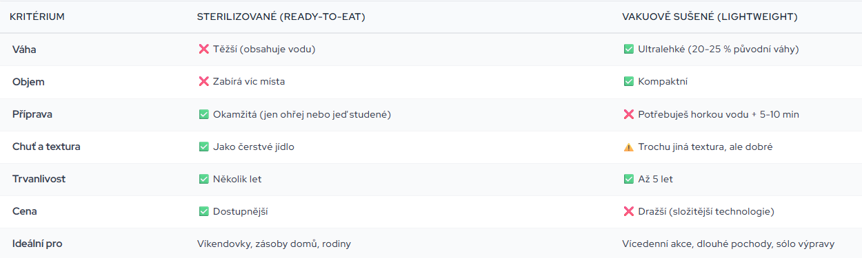 🍲 DVA ZÁKLADNÍ TYPY JÍDLA: STERILIZOVANÉ vs. VAKUOVĚ SUŠENÉ
