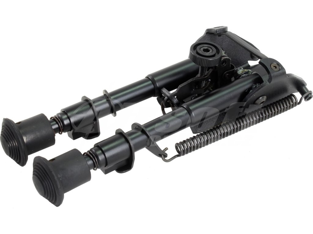Sklopná kovová dvojnožka uzpůsobená k uchycení na zbraně pomocí standardních čepů pro oka nosných popruhů.
