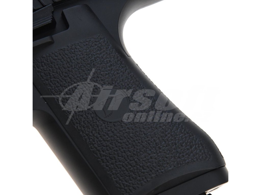 Tato zbraň kombinuje kovový závěr s robustním rámem z ABS plastu, což jí propůjčuje vynikající pevnost při zachování přiměřené hmotnosti 1 113 g. Délka zbraně činí 275 mm a vnitřní hlaveň měří 135 mm. Zásobník má kapacitu 22 BBs a je poháněn běžnou 12g CO2 bombičkou, která se vkládá přímo do zásobníku. Pistole dosahuje úsťové rychlosti až 110 m/s (360 FPS), což odpovídá energii 1,21 J – ideální pro hráče, kteří chtějí výkonnou a efektní zbraň s mohutným zvukem i zpětným rázem.