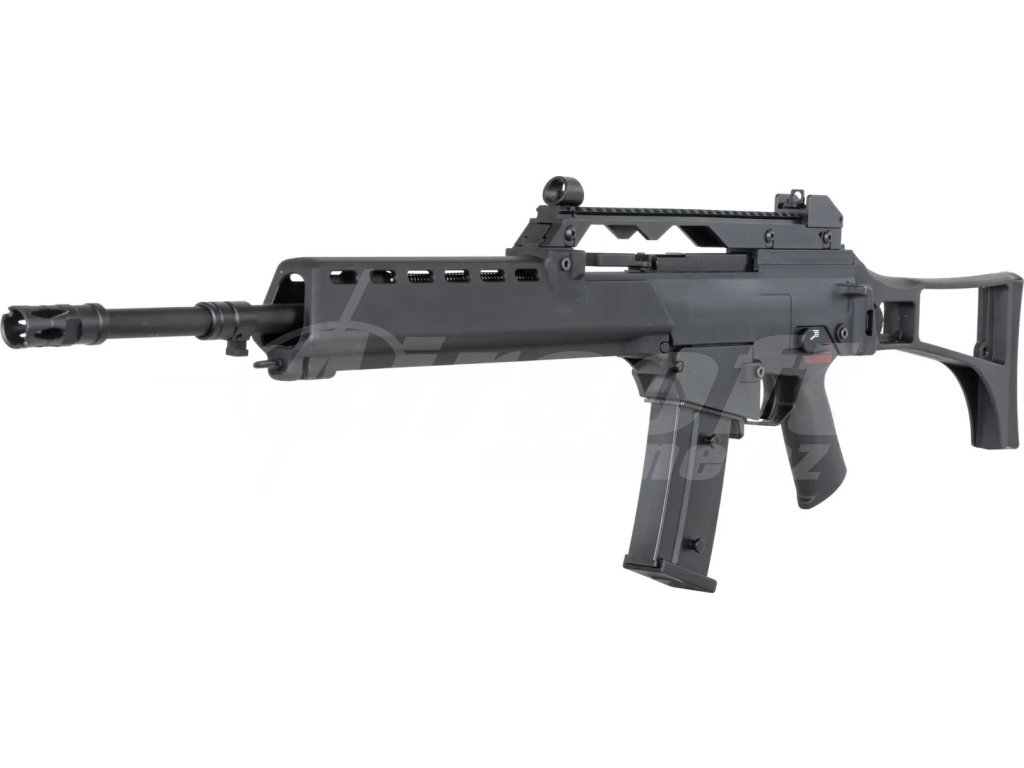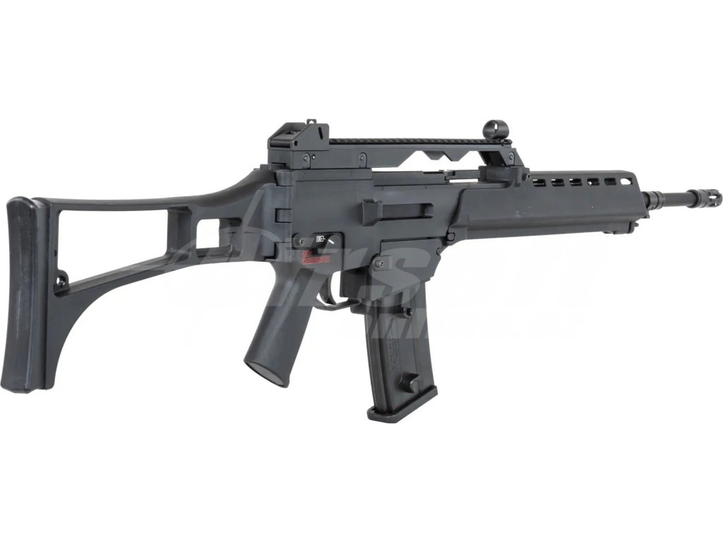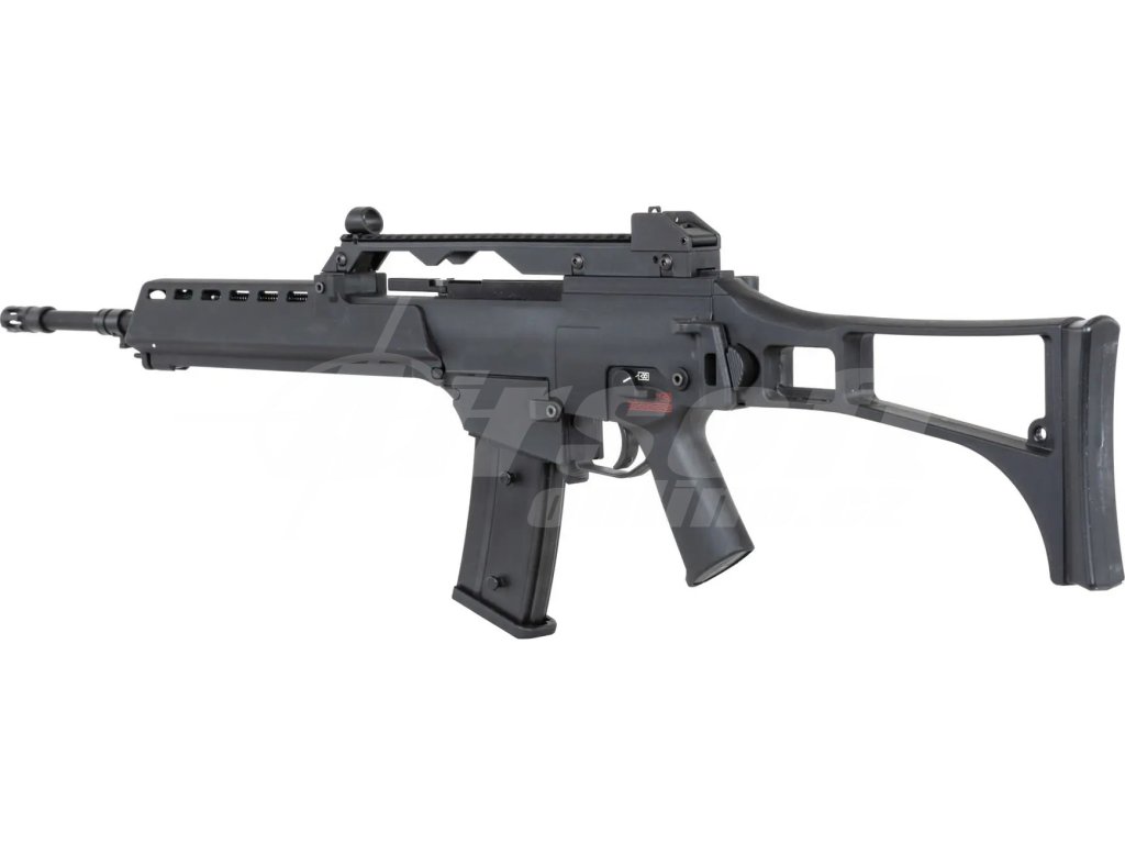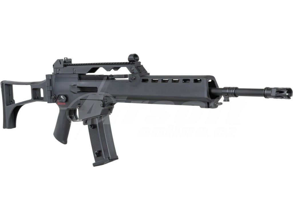 Reálnou předlohou pro tuto repliku je německá útočná puška G36, konkrétně její verze G36E2. Tento model byl vyvinut firmou Heckler & Koch v 90. letech jako náhrada za starší G3. G36E2 byl používán německou armádou i dalšími evropskými jednotkami, přičemž vynikal modulární konstrukcí, nízkou váhou a spolehlivostí v extrémních podmínkách. Puška je známá i díky svému charakteristickému vzhledu a sklopné pažbě, která je přítomna i u této airsoft repliky.