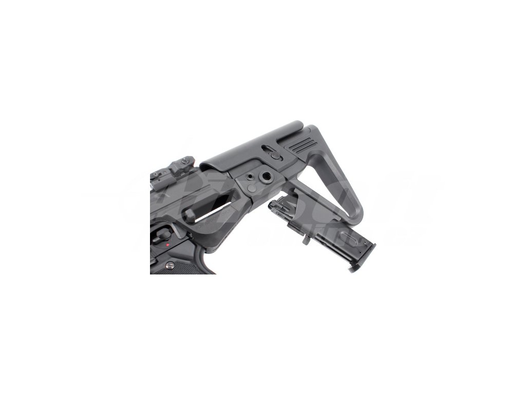 - Teleskopická pažba: Nastavitelná pažba s volitelnou lícnicí zlepšuje stabilitu zbraně při střelbě a poskytuje lepší kontrolu.