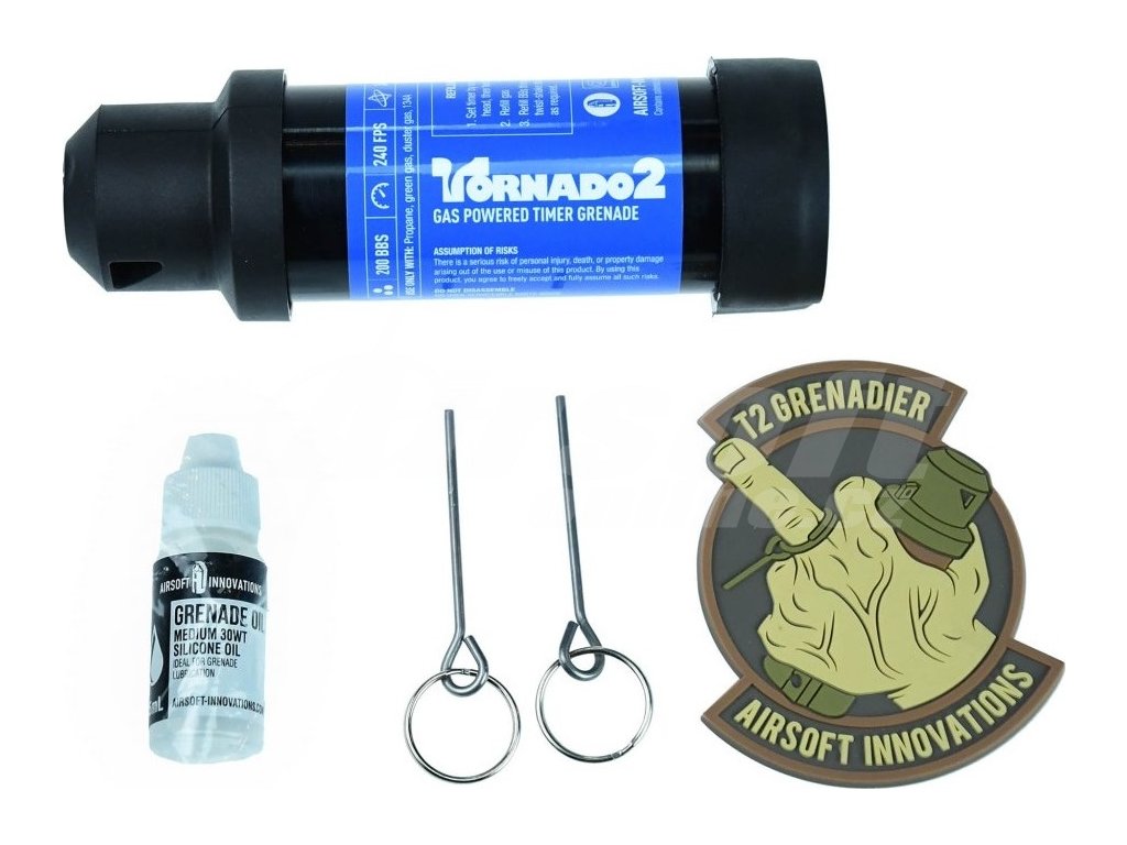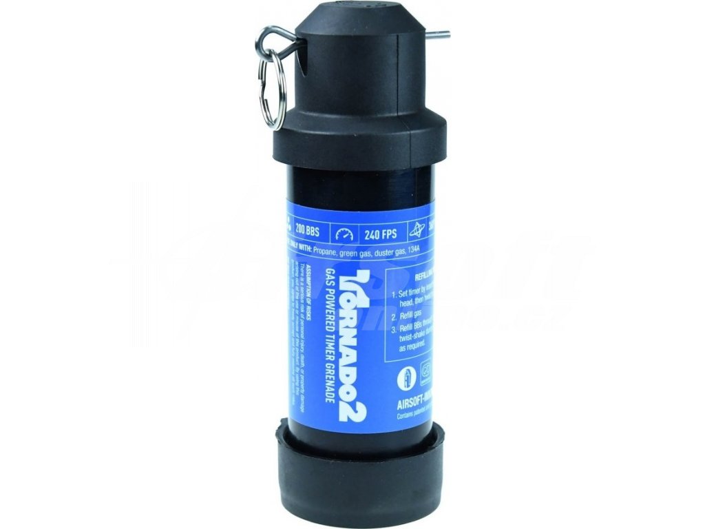 Tornado 2 vystřelí 200 kuliček (více než jakýkoliv jiný airsoftový granát) rychlostí 240 fps (73 m/s – dvakrát rychleji než jakýkoliv jiný granát) při pokrytí 360 stupňů. Nastav časovač na jeden ze tří režimů, naplň plynem, poté kuličkami a je to! Tornado 2 je připraven k použití! Bez rozebírání, bez skládání a se snadným plněním.