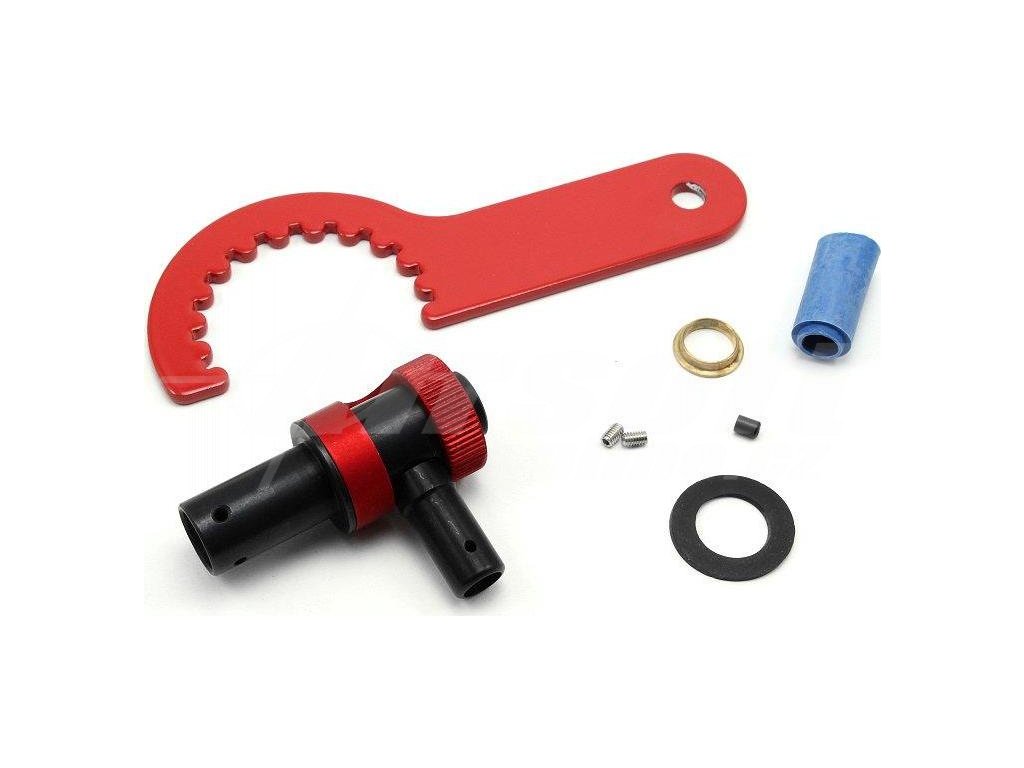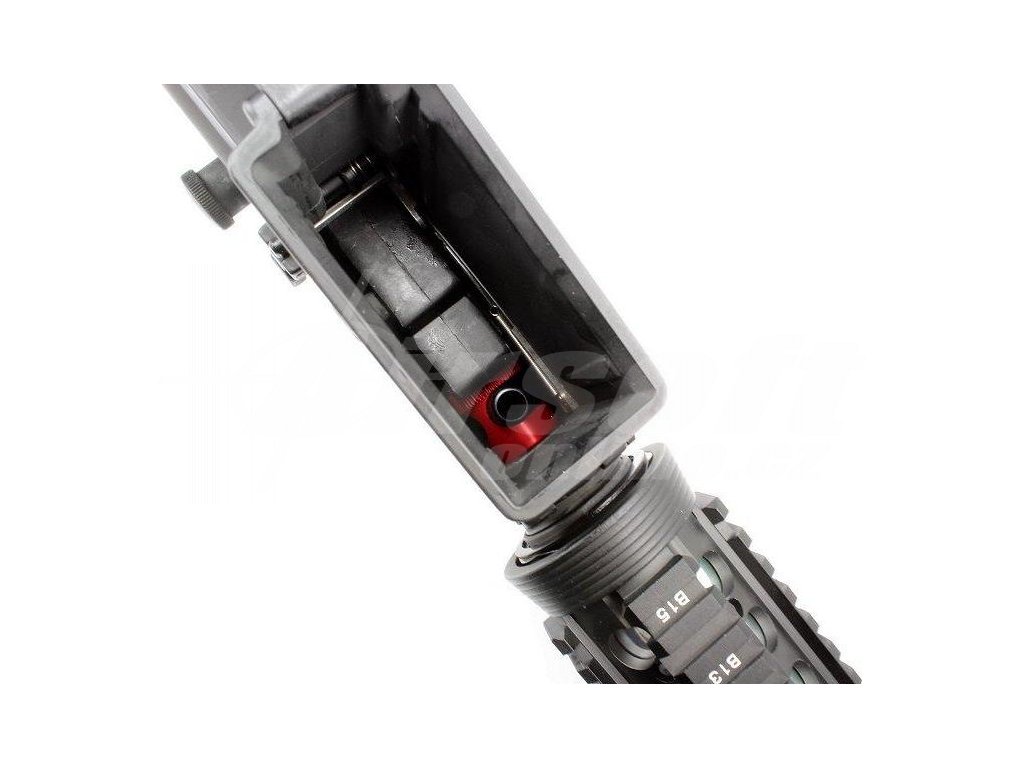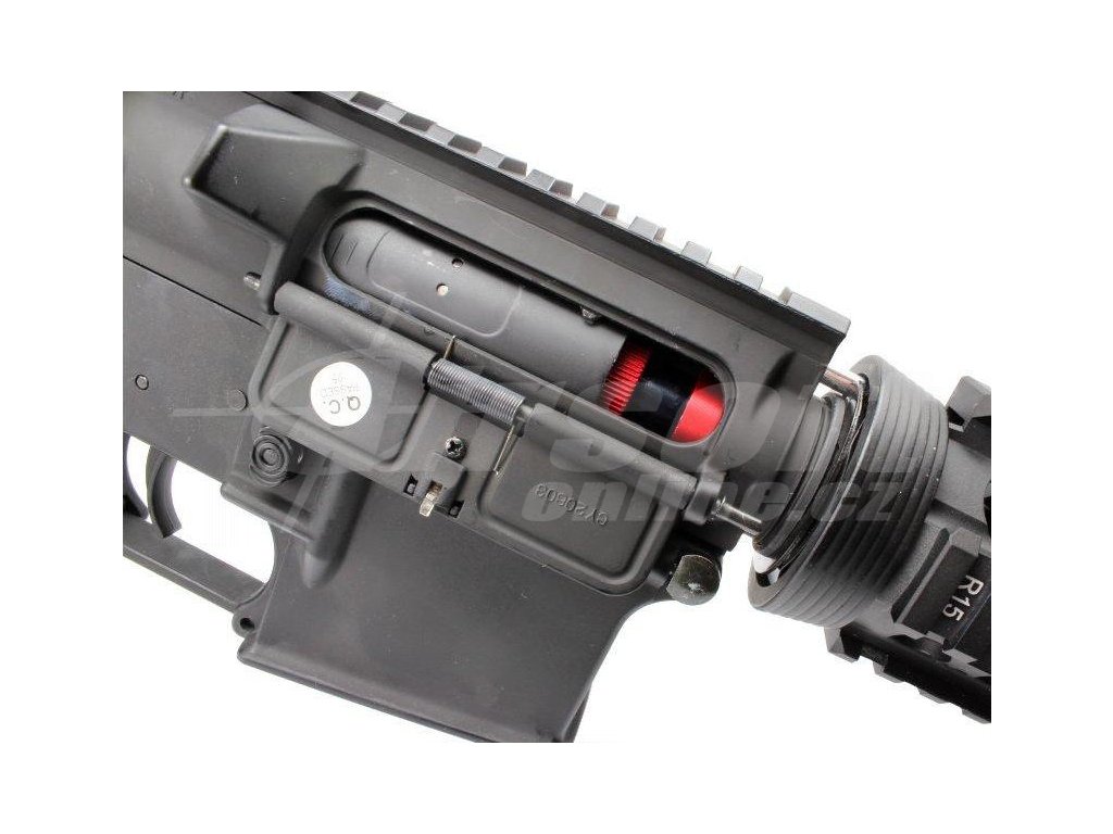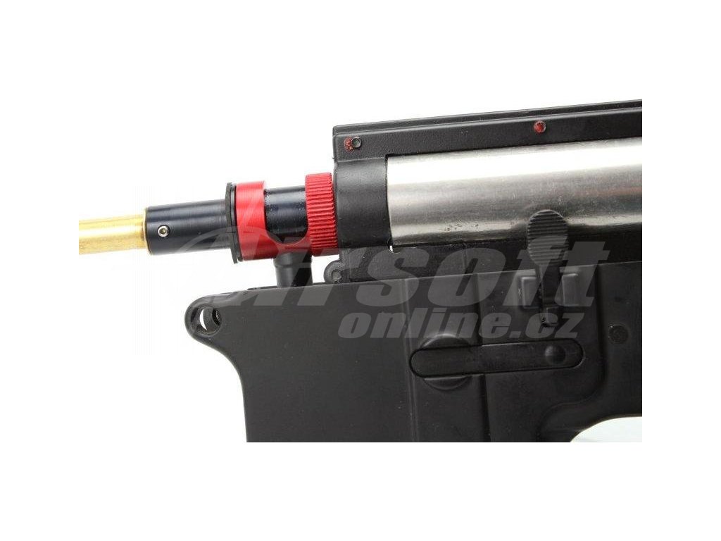 Regulace HopUp přítlaku probíhá pomocí červeného kovového prstence. Ten lze otáčet takřka o 360° a regulace přítlaku je tak velmi plynulá a citlivá. Pod regulačním prstencem je gumový kroužek proti samovolnému povolení při střelbě. V balení je dodávána kvalitní HopUp gumička Aimtop 50° s dvojitým výstupkem. Uživatel ale samozřejmě může použit původní nebo jakoukoliv jinou HopUp gumičku pro elektrické zbraně a dosáhnout třeba i lepšího utěsnění.
