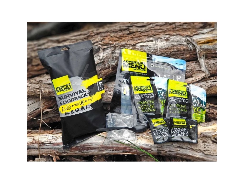 Teplé plnohodnotné jídlo pro dva vždy a všude s sebou s extrémní trvanlivostí 6 let!!! To je nový Survival Food Pack od Adventure Menu. V autě v koloně, na chatě, v přírodě nebo doma jako železná zásoba. Můžete na něj klidně zapomenout a až bude nejhůř, bude tam na Vás čekat. Perfektní dávka potravin pro vojáky, preppery a všechny, kteří chtějí být připraveni na vše. Survival Food Pack obsahuje dvě hlavní jídla – 2 x 300 g, kompletní samoohřevný systém (2 x ohřevná kapsle 20 g, 1x Zipper bag, aktivační voda) a plastovou lžíci.