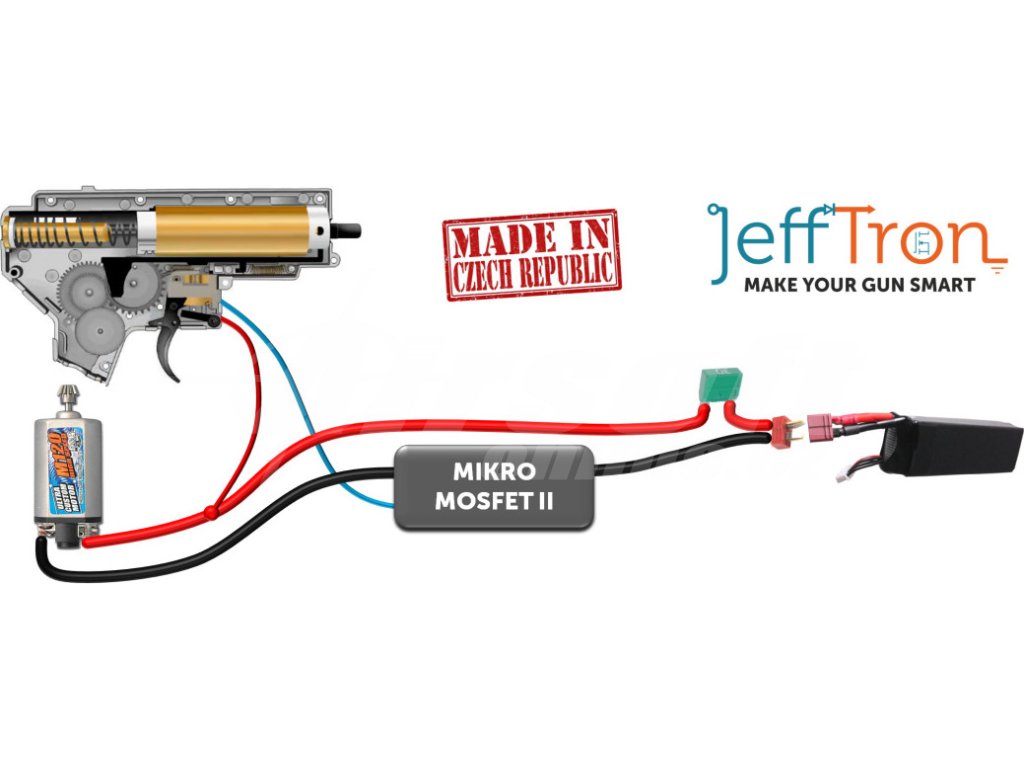 - Pokud chcete použít vlastní vodiče, zvolte variantu bez kabelážeUrčeno pro pružiny do m160 (odpovídá proudu 75A při jednotlivém výstřelu nebo 25A střelby dávkou po dobu max. 30s). Pro vyšší zatížení zvolte Mosfet II