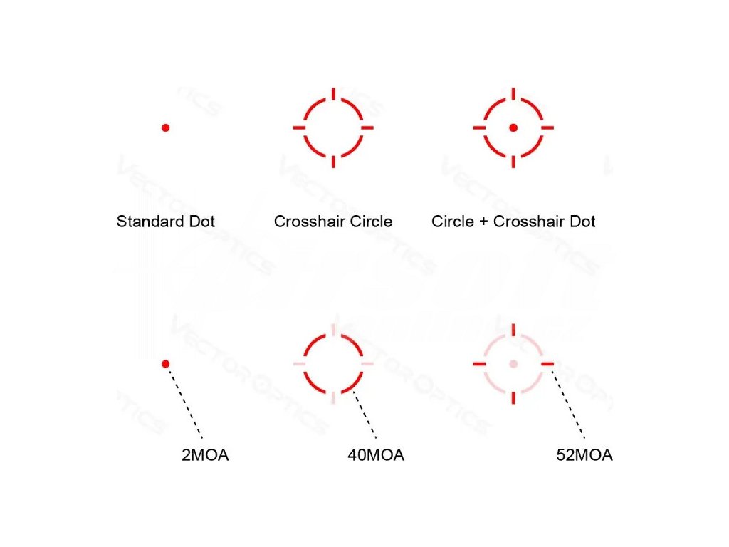 - Záměrné body: 2 MOA tečka, 40 MOA kruh, 52 MOA kruh s tečkou