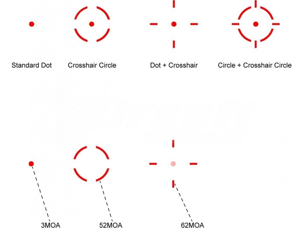 - Záměrné body: 3 MOA tečka, 52 MOA kruh, 62 MOA kříž (a jejich kombinace)