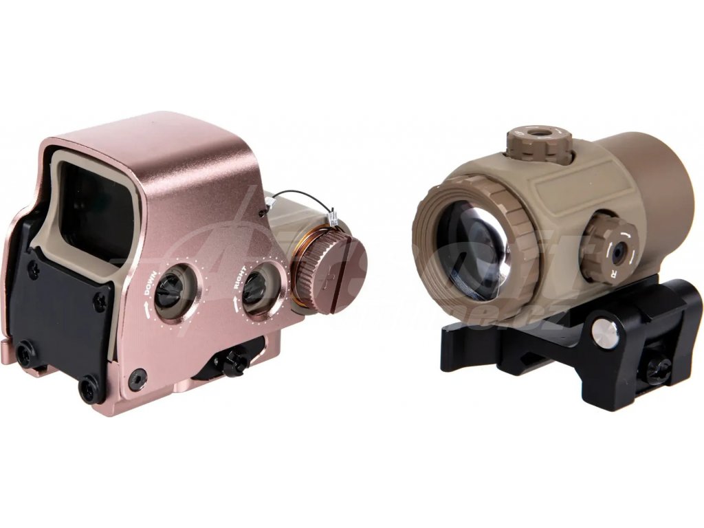 Kolimátor typu XO včetně Magnifier typu T43 vyrobený společností WADSN napájen baterií CR123. Kolimátor umožňuje použití červeného a zeleného zaměřovacího bodu pro denní i noční operace. Zaměřovací bod je nastavitelný a lze jej nastavit vertikálně i horizontálně a má několik stupňů intenzity. Kolimátor se montuje na standardní 22mm RIS lištu a umožňuje okamžité a přesné zamíření. Součástí sady je kvalitní Magnifier typu T43 se 3x zvětšením.