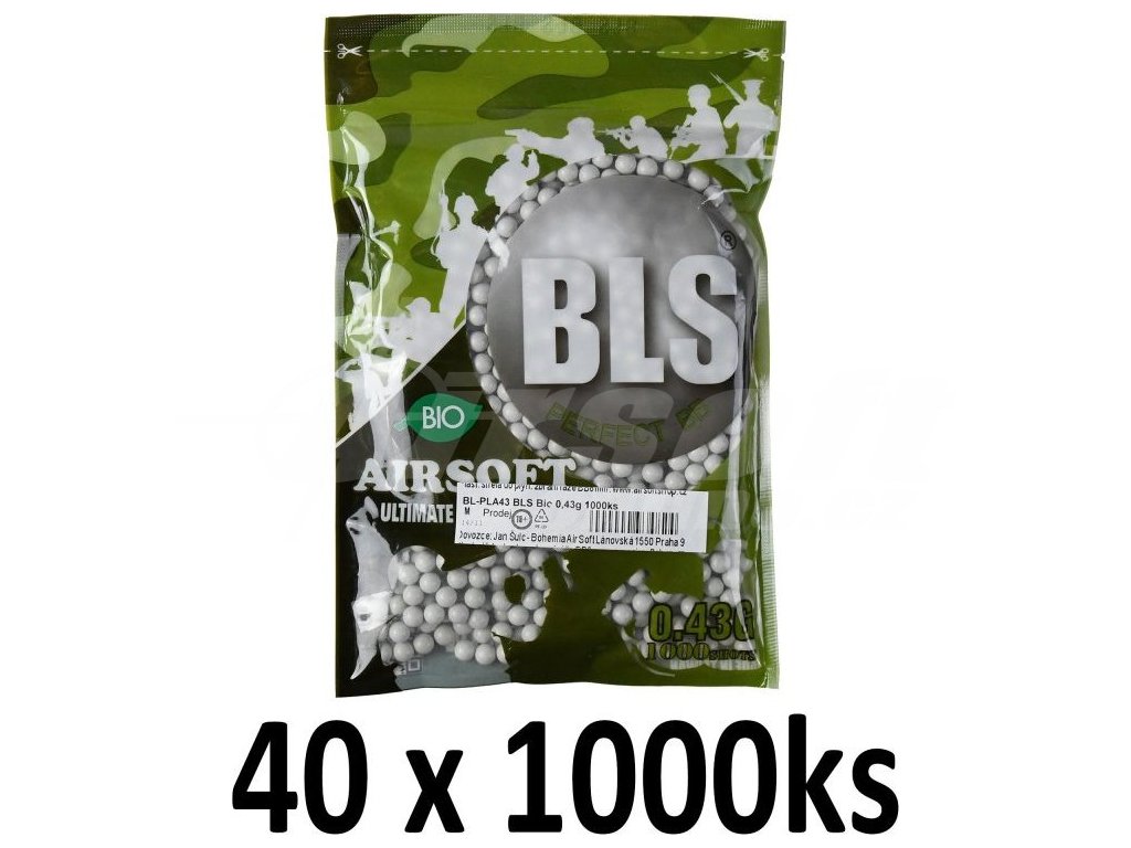 Airsoftové kuličky BLS Ultimate Heavy BIO 0,43g, 1000bb, bílé, 40x