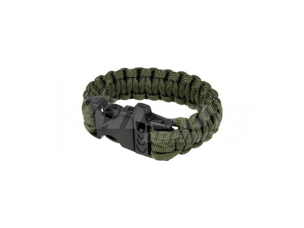 Náramek z pleteného paracordu. Je vybaven odolnou polymerovou sponou s integrovanou hlasitou píšťalkou.