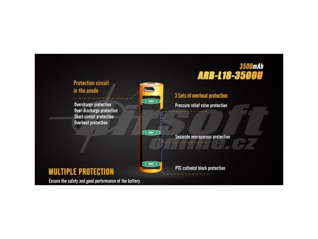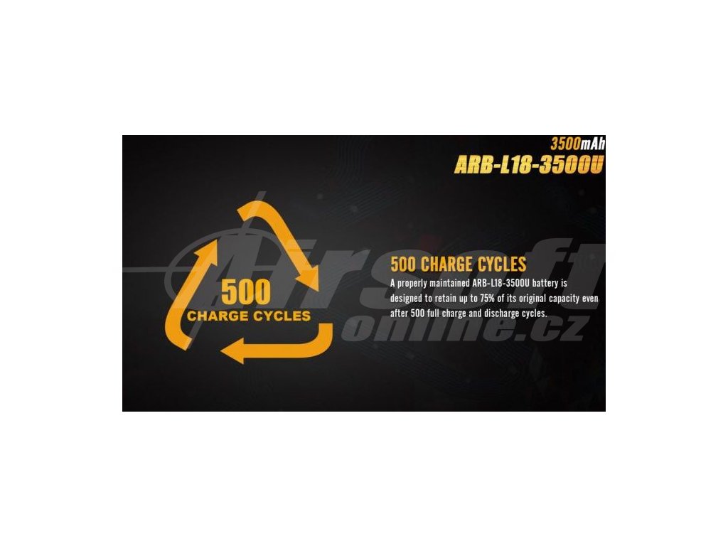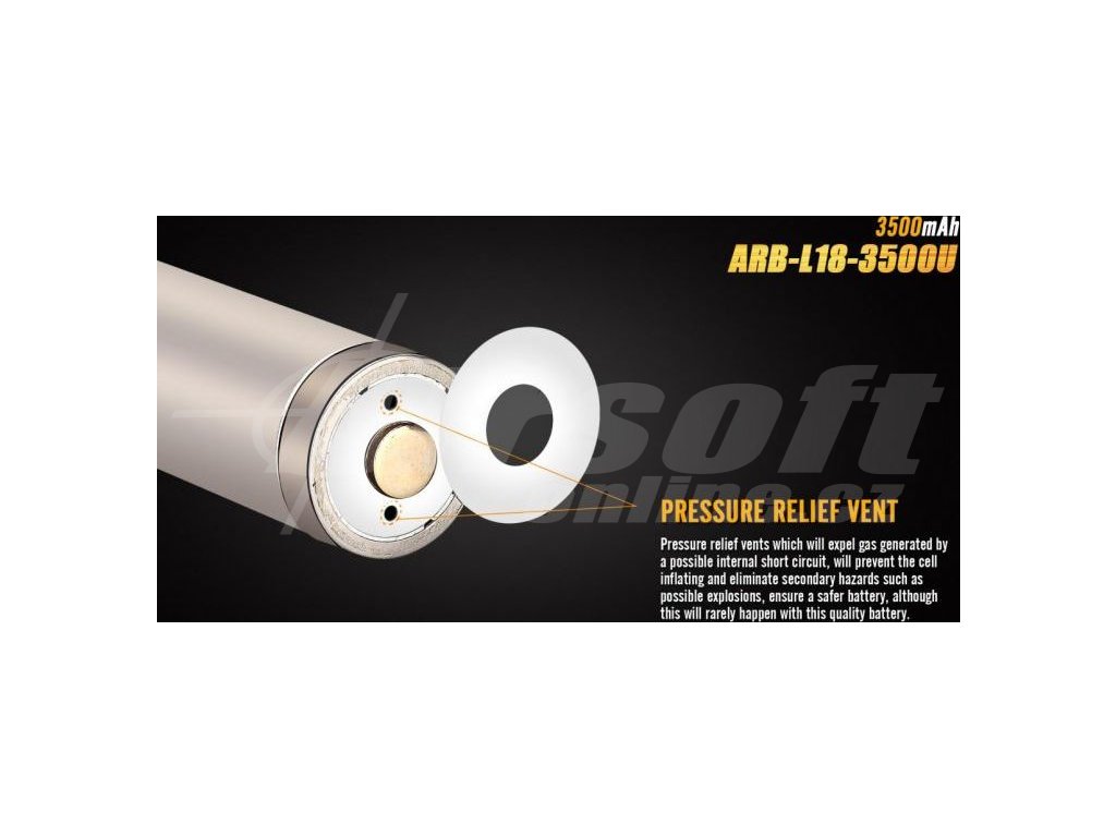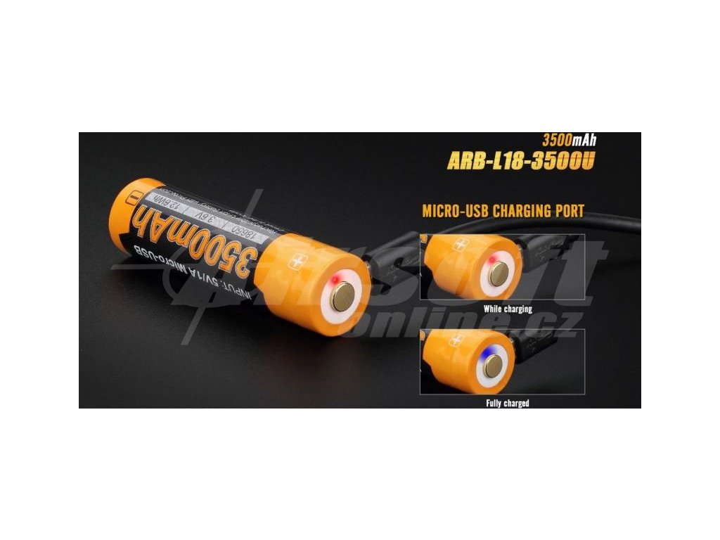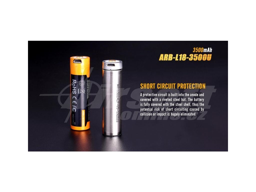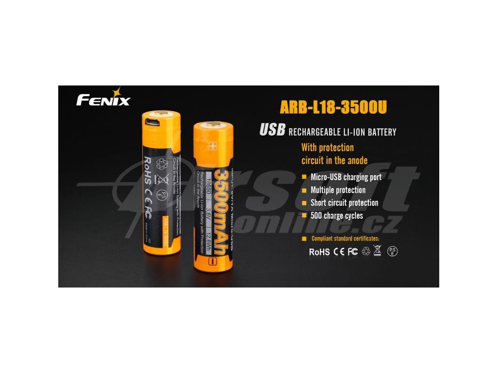 Nabíjecí baterie Fenix 18650 3500 mAh (L18-3500U) s vlastním nabíjecím micro-USB konektorem. Lze ji nabíjet připojením kabelu do micro-USB konektoru (např. z počítače či nabíječkou na mobilní telefon) tak i v klasické nabíječce. Li-ion nabíjecí baterie se vyznačují velmi vysokou kapacitou, netrpí paměťovým efektem a ani samovybíjením. Li-ion ve velikosti 18650 jsou nejlepší volbou z hlediska uchované energie vzhledem k rozměrům a váze akumulátoru.