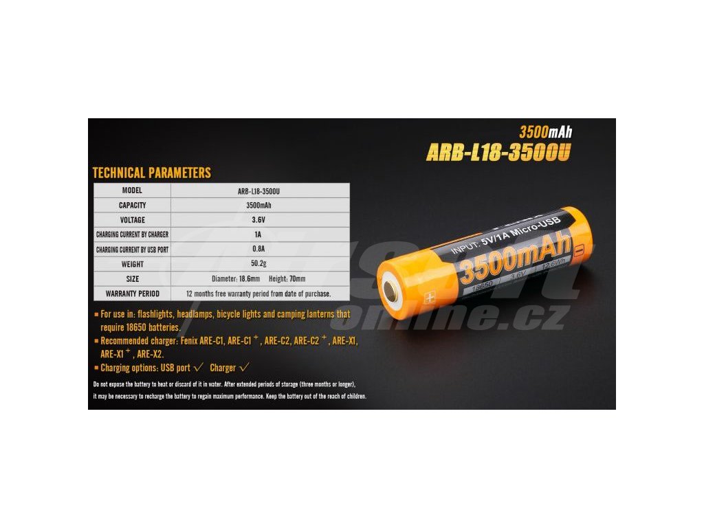- Rozsah dodávky: jeden kus akumulátoru Fenix 18650 3500mAh USB (ARB-L18-3500U).
