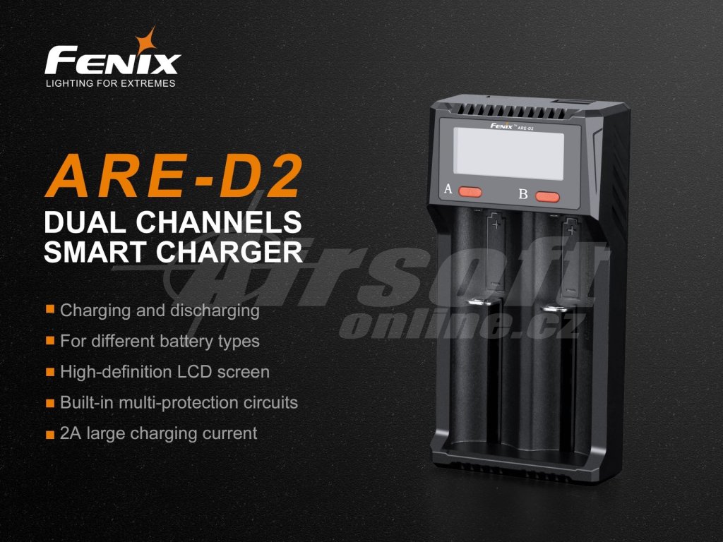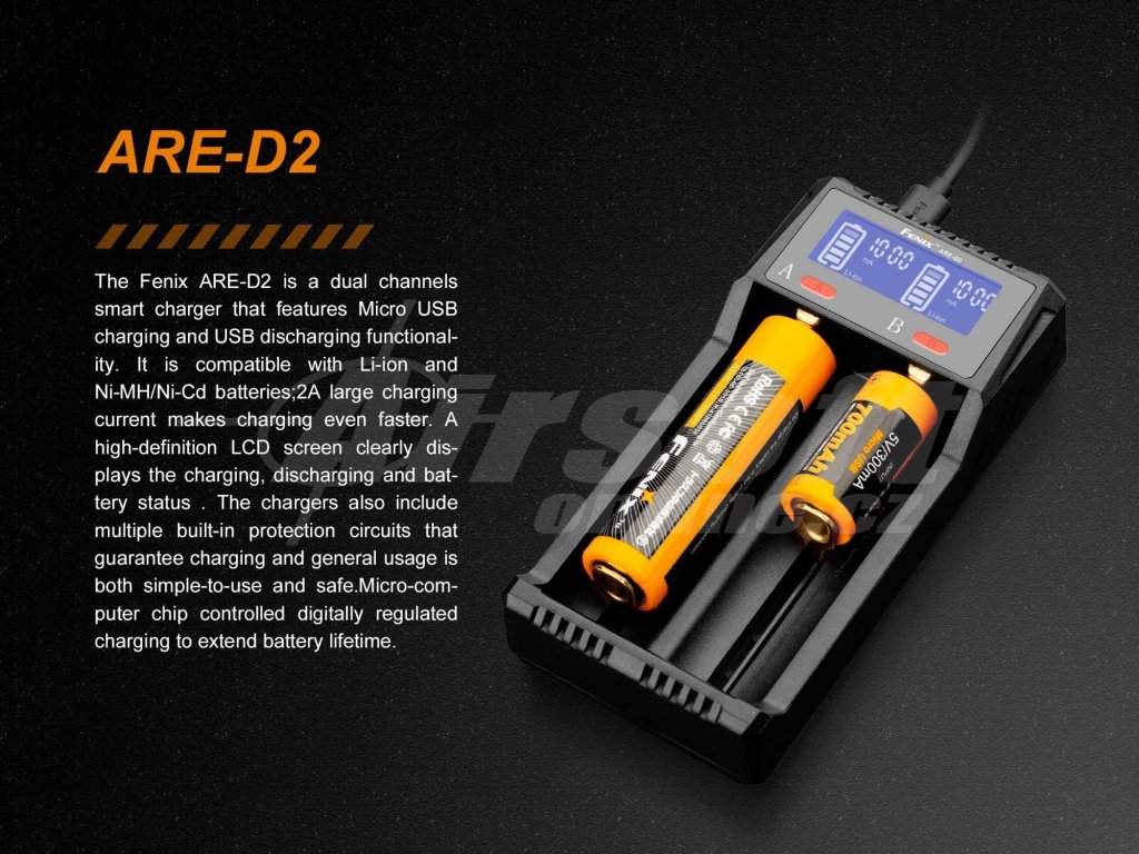 Fenix ARE-D2 je kompaktní USB nabíječka se dvěma nezávislými nabíjecími kanály, která je určená pro Li-ion a NiMH/NiCd akumulátory. Nabíječka je ideální pro cestování díky svým malým rozměrům a nízké hmotnosti. Při vložení nabitých Li-ion článků umožňuje fungovat jako záložní zdroj (powerbanka) pro dobíjení dalších zařízení přes USB. Přehledný LCD displej zobrazuje typ baterie, napětí a další parametry.