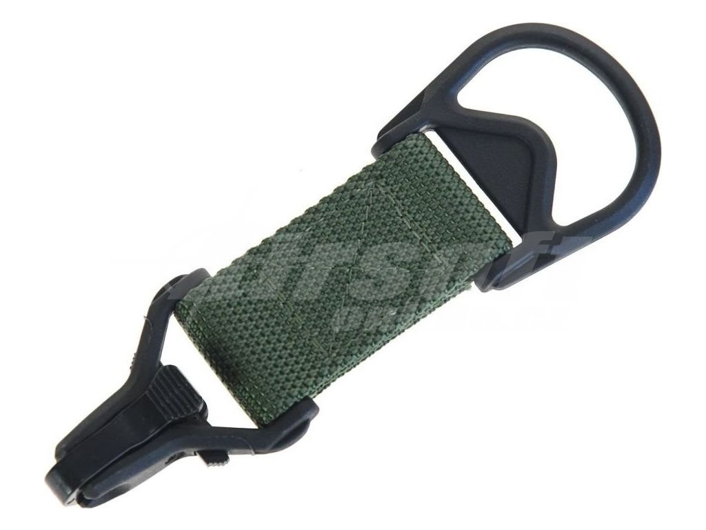 Plastová karabina s okem pro popruhy typu MS3 v zelené barvě.