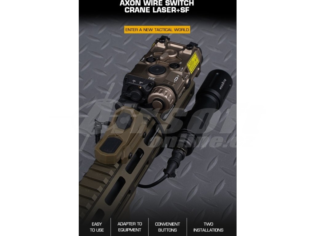 Dlouhé spodní tlačítko slouží pro ovládání laserových značkovačů, zatímco kulaté horní tlačítko spíná svítilnu. Tato verze je vybavena konektory SF a Crane Plug, což zajišťuje kompatibilitu s většinou taktických svítilen a PEQ boxů používaných v airsoftu. Vyrobeno z pevného a lehkého nylonu v pískovém provedení (tan). Ideální příslušenství pro airsoft výstroj a taktické vybavení pro milsim akce.