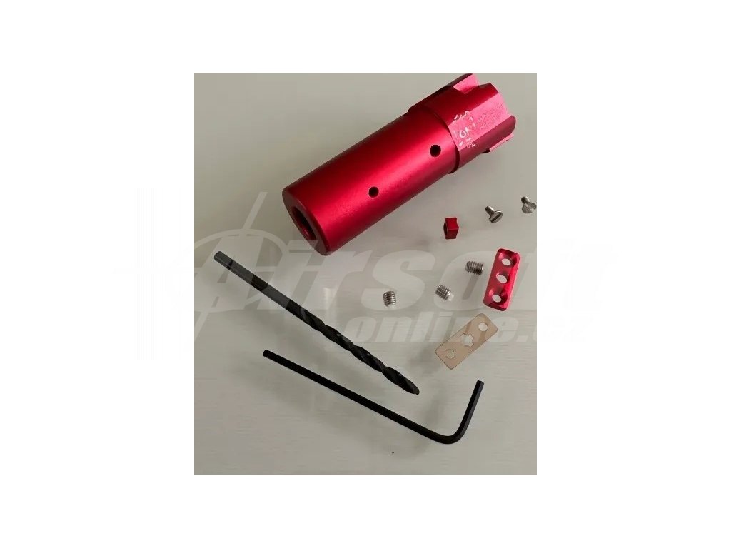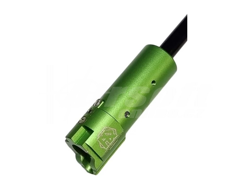 Vnitřní hlaveň je perfektně zajištěna a zarovnána díky GBB hop-up gumičce a pevně drží na místě pomocí dvou šroubů s nylonovým hrotem. Dbejte na to, abyste je příliš neutáhli. Po vyvrtání otvoru v horní části těla pistole nasuňte hlaveň a gumičku do hop-up komory zezadu. Před pokračováním v montáži vždy nezapomeňte zkontrolovat, zda při vrtání nevznikly nějaké nečistoty které by zůstali v komoře.