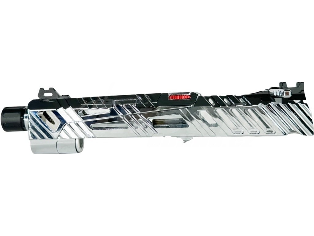 Závěr je vyroben z vysoce odolného hliníku 6061 přesným CNC obráběním a má design split-slide (pohybuje se jen část závěru) s úpravou pro fixní vnější hlaveň (non-recoil).