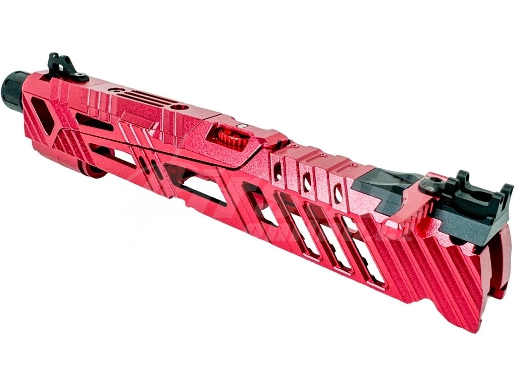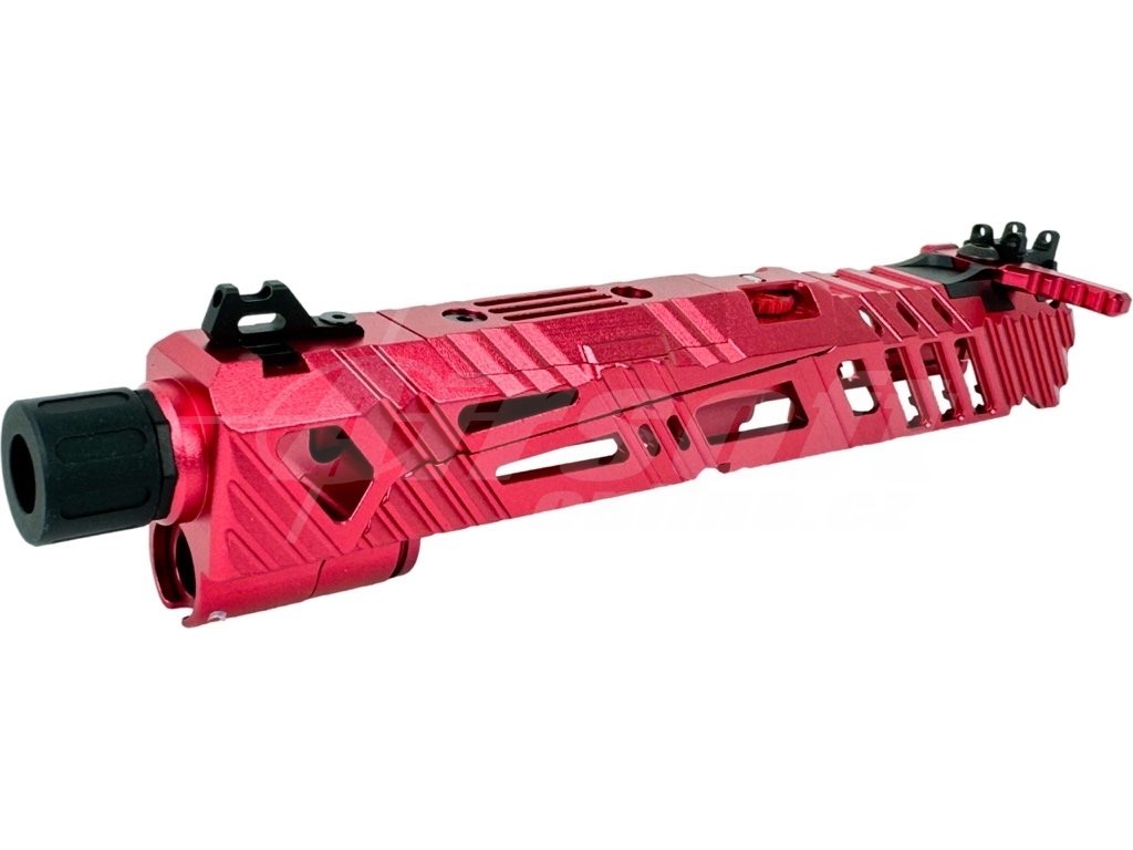 Závěr je vyroben z vysoce odolného hliníku 6061 přesným CNC obráběním a má design split-slide (pohybuje se jen část závěru) s úpravou pro fixní vnější hlaveň (non-recoil).