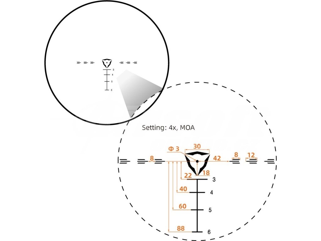 - Rozsah elevace/větru: 90 MOA