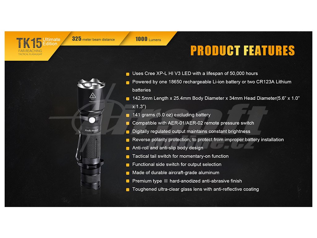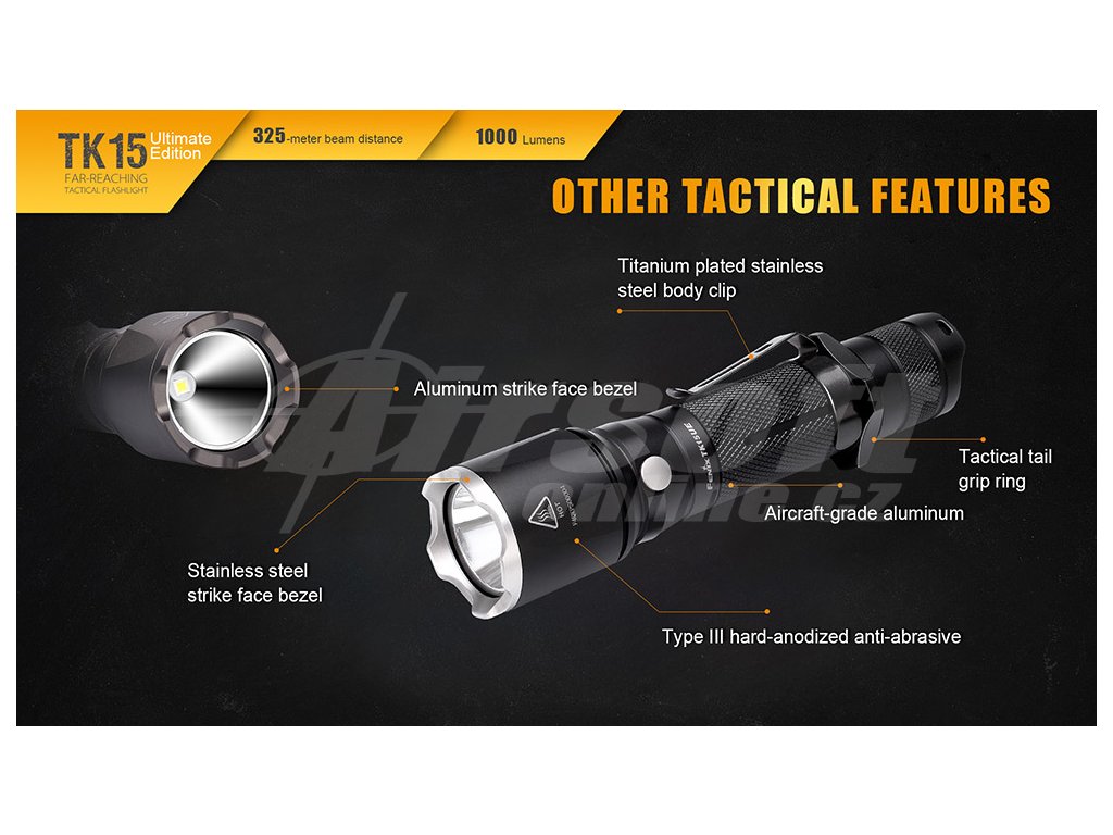 LED svítilna Fenix TK15 UE je díky svému masivnímu provedení pevná jako tank a přitom si zachovává kompaktní velikost. Svítilna je napájena digitálně kontrolovaným konstantním proudem pro zaručení stálého světelného výkonu i při snižování napětí v bateriích (při jejich pozvolném vybíjení). Fenix TK15 UE disponuje celkem pěti režimy osvětlení. Tento model je nástupcem oblíbených modelů Fenix TK15 a TK15C.