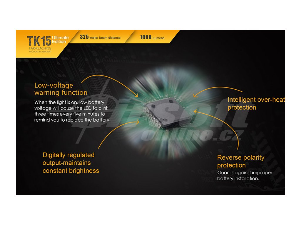 - Inteligentní ochrana proti přehřátí – pokud vzroste teplota svítilny nad 65°C, tak začne automaticky snižovat výkon v pozvolných krocích o 5 % každých 30 vteřin, dokud se její teplota neustálí. Jakmile teplota svítilny klesne pod 65°C, tak se výkon opět automaticky zvýší na původní úroveň. Provoz na nejvyšší režim výkonu tak není omezen časově, ale pouze teplotou.