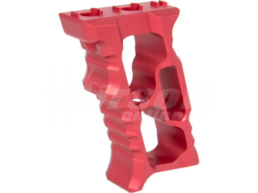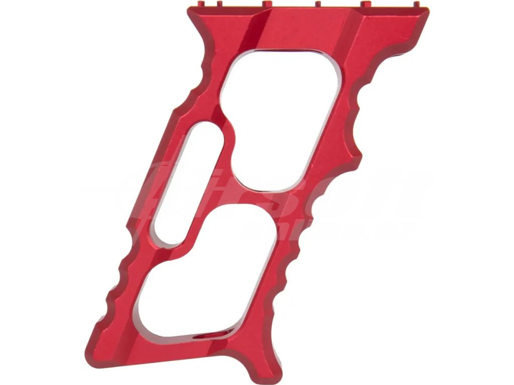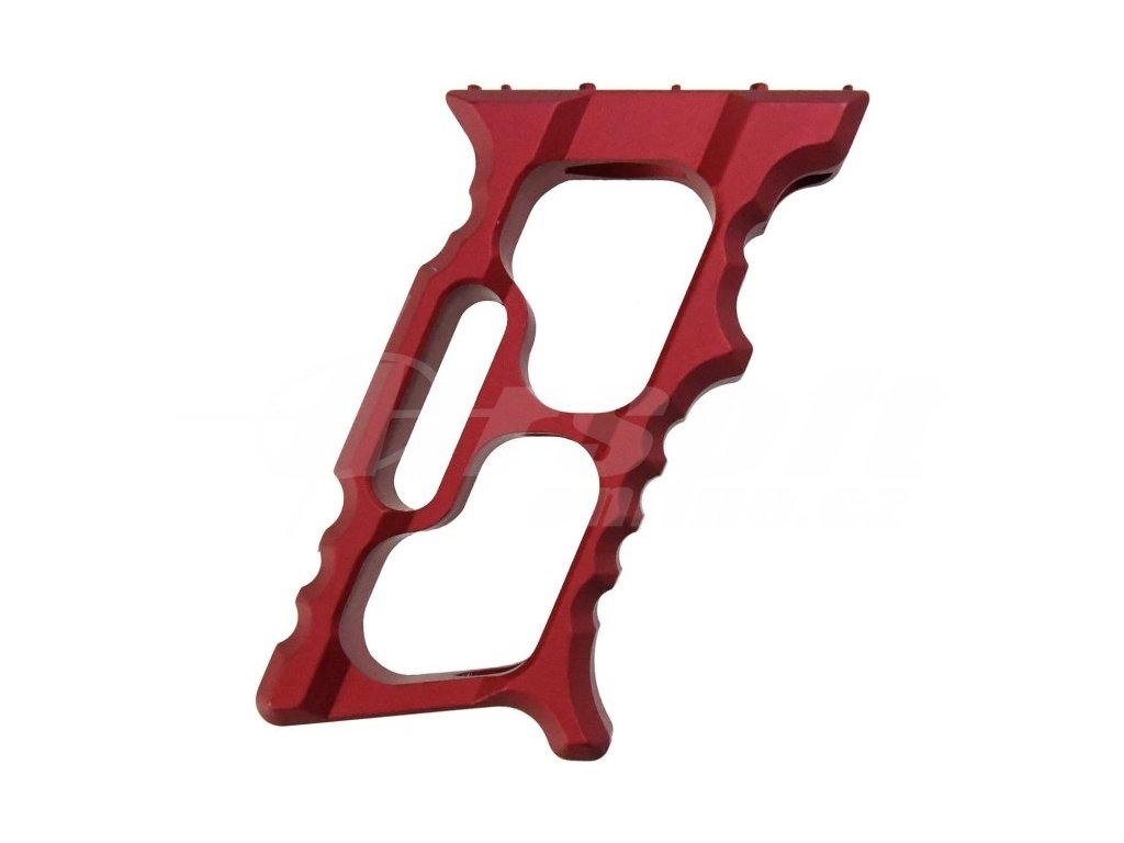 Na rozdíl od běžných vertikálních rukojetí nabízí úhlový design lepší ergonomii a snižuje únavu při dlouhodobém používání na airsoftových hrách. Kostrová konstrukce zaručuje vysokou odolnost při zachování nízké hmotnosti pouhých 67 gramů. Precizní CNC obrábění z hliníku zajišťuje maximální kvalitu a dlouhou životnost. Univerzální montáž na M-LOK i Keymod systémy činí z této rukojeti ideální volbu pro moderní taktickou výstroj. Výrazná červená barva dodává vaší zbrani unikátní vzhled.