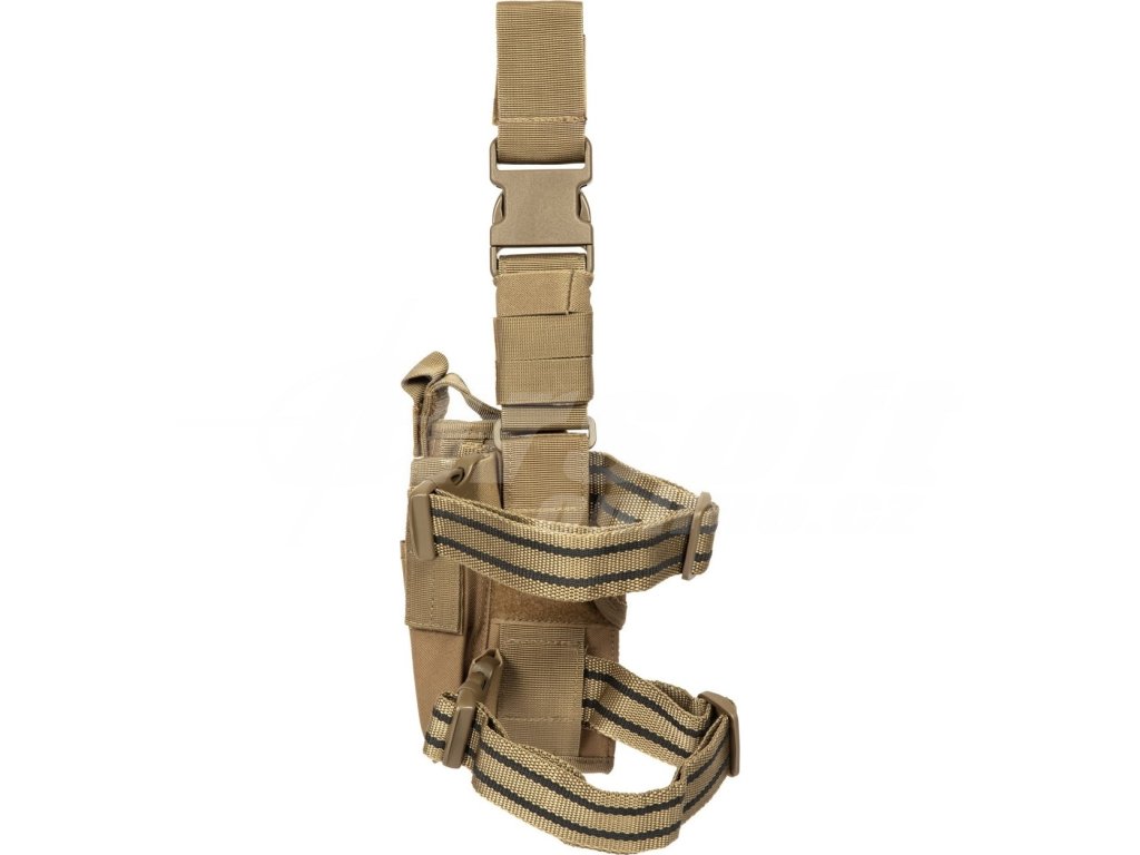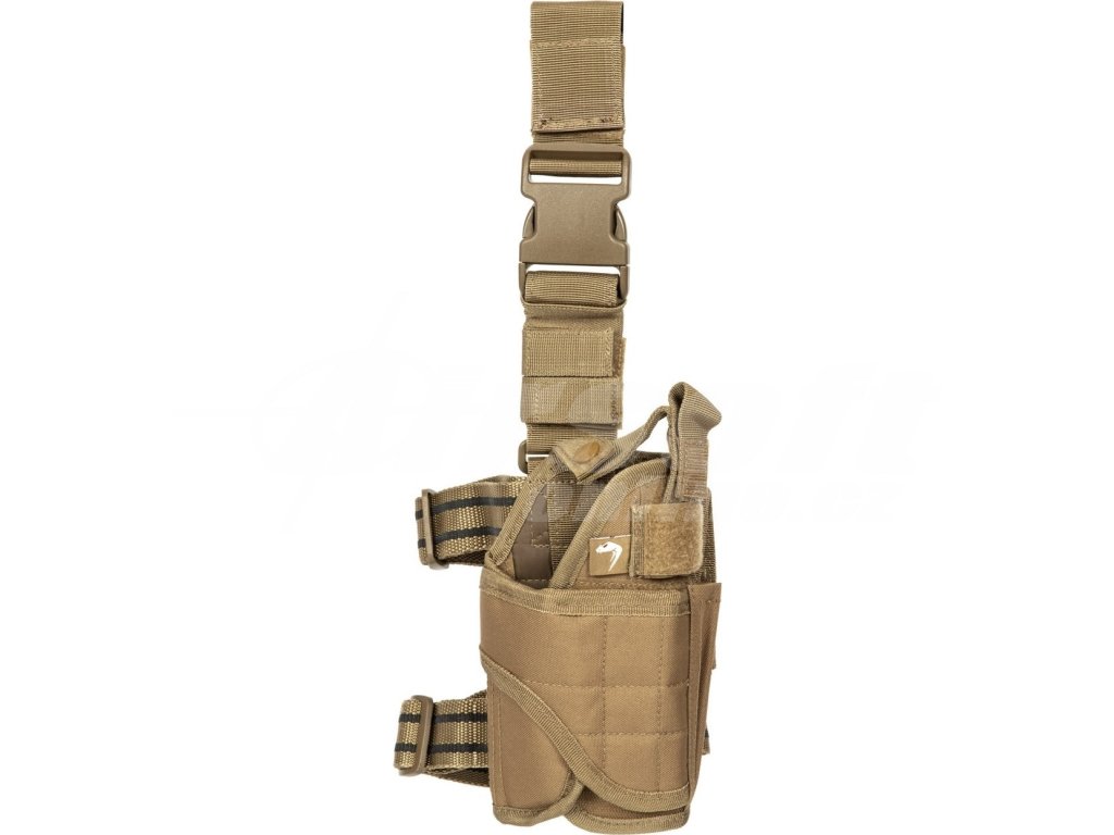 Univerzální taktické pouzdro na nohu z odolného nylonu pro nošení různých velikostí pistolí. Pouzdro si uživatel může upravit pomocí suchého zipu. Západkový zámek chrání pistoli před ztrátou. Pouzdro má upevnění na opasek a 2 popruhy kolem stehna, uzavíratelné na přezku. Pouzdro se přizpůsobí uživateli díky popruhům.