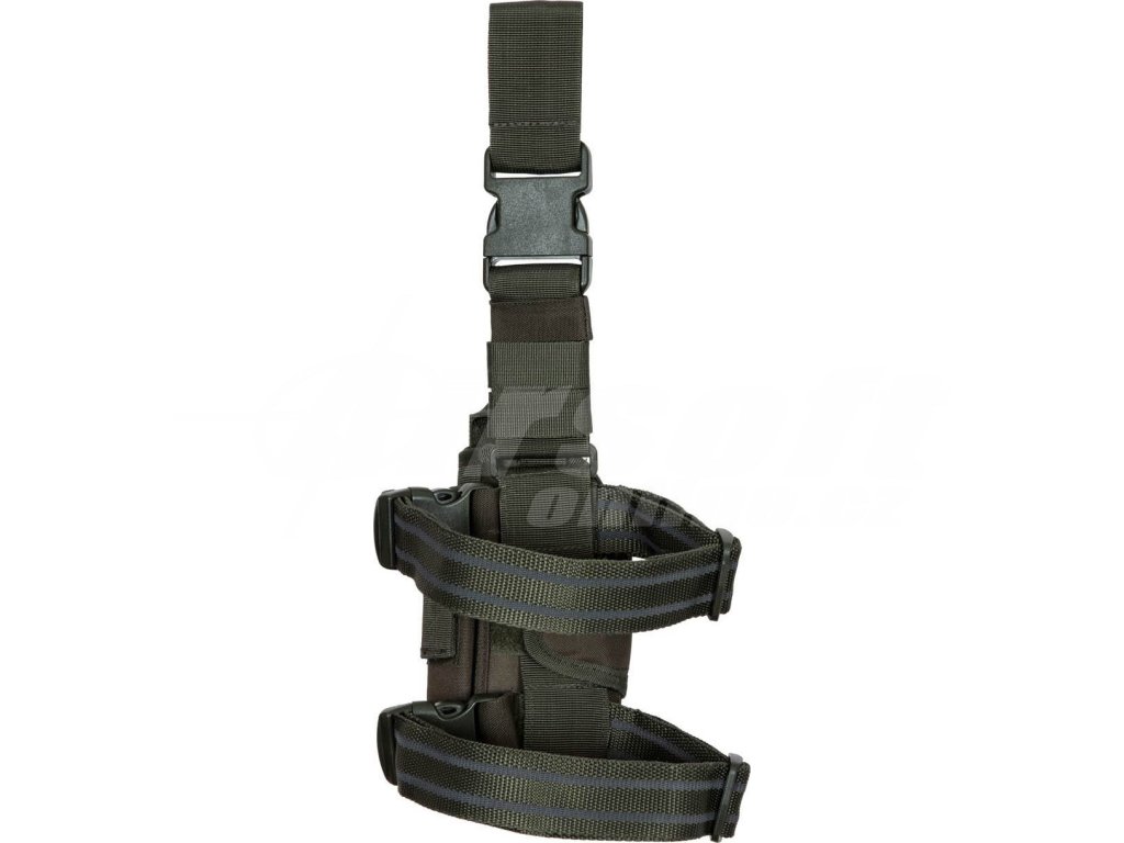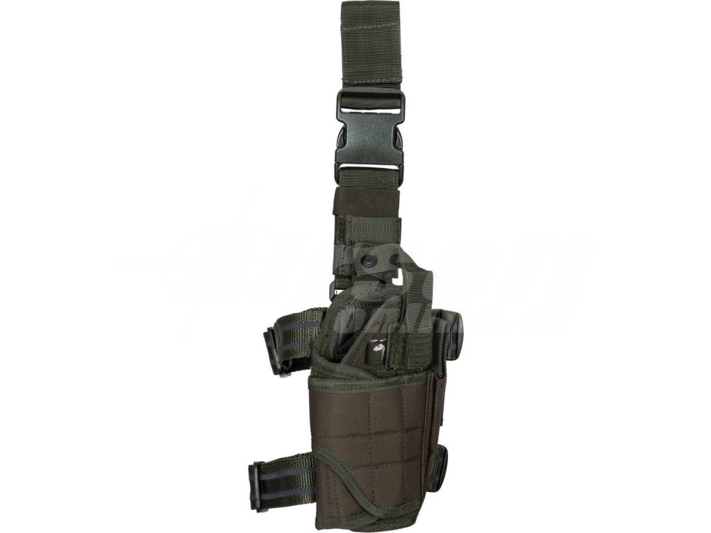 Univerzální taktické pouzdro na nohu z odolného nylonu pro nošení různých velikostí pistolí. Pouzdro si uživatel může upravit pomocí suchého zipu. Západkový zámek chrání pistoli před ztrátou. Pouzdro má upevnění na opasek a 2 popruhy kolem stehna, uzavíratelné na přezku. Pouzdro se přizpůsobí uživateli díky popruhům.