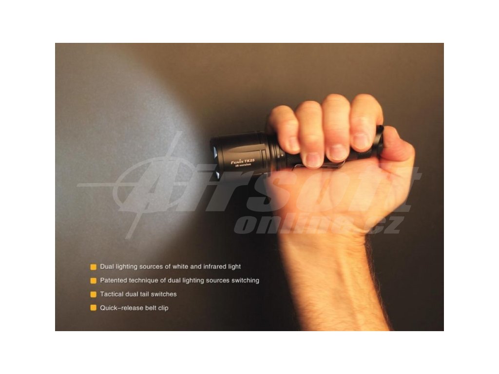 Výkonná taktická svítilna Fenix TK25 IR nabízí špičkový světelný tok až 1000 ANSI lumenů bílého světla a navíc dvě infračervené LED o vlnové délce 850 nm a maximálním výkonu 3000 mW. Tato vlnová délka je kompatibilní s většinou systémů pro noční vidění. Velmi solidní a voděodolné provedení a dvouvrstvá konstrukce těla předurčuje tuto taktickou svítilnu pro drsné venkovní podmínky, pro profesionály, ozbrojené složky i myslivost. Svítilna Fenix TK25 IR používá duální taktický spínač, který umožňuje rychlejší a spolehlivější ovládání v krizových situacích. Lze ji například snadno zapnout přímo do stroboskopického režimu. Svítilna je napájena digitálně kontrolovaným konstantním proudem pro zaručení stálého světelného výkonu i při snižování napětí v bateriích (při jejich pozvolném vybíjení).