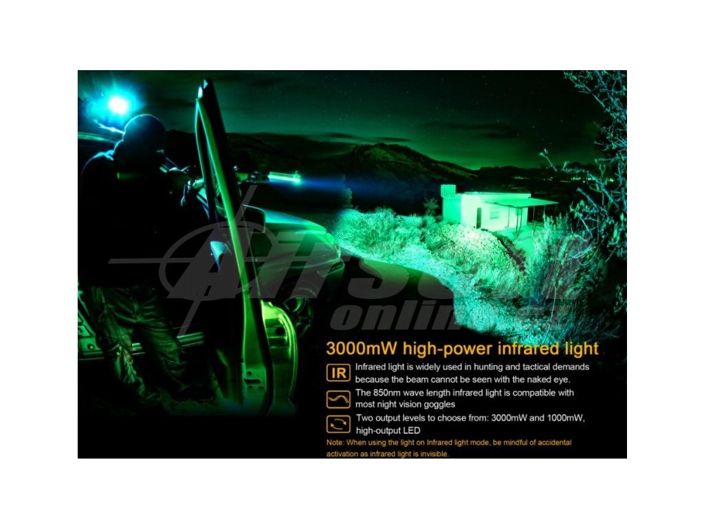 - Dva režimy infračerveného světla: 3000 mW (3,75 hodiny) -> 1000 mW (12 hodin).
