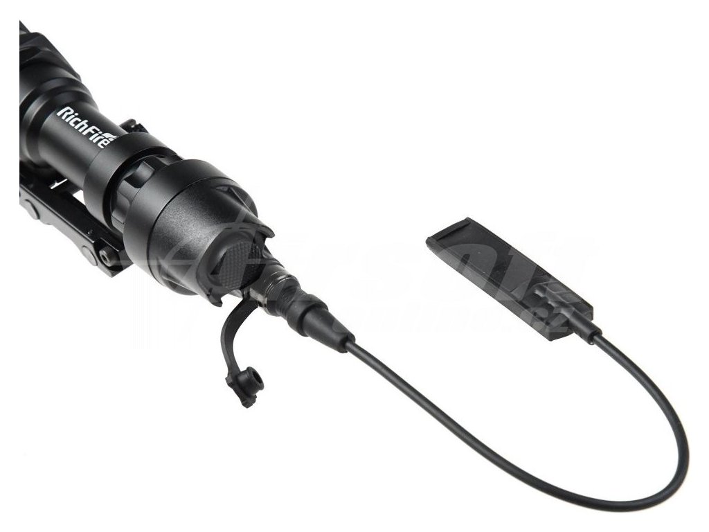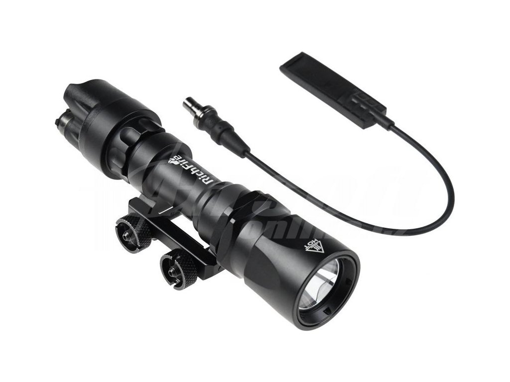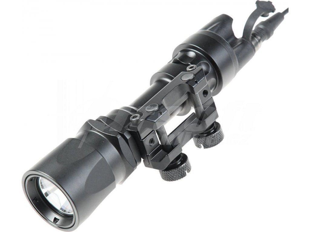 Kovová svítilna s montáží na zbraň. Ke svítilně je možné připojit spínací kabel bez nutnosti rozebírání.