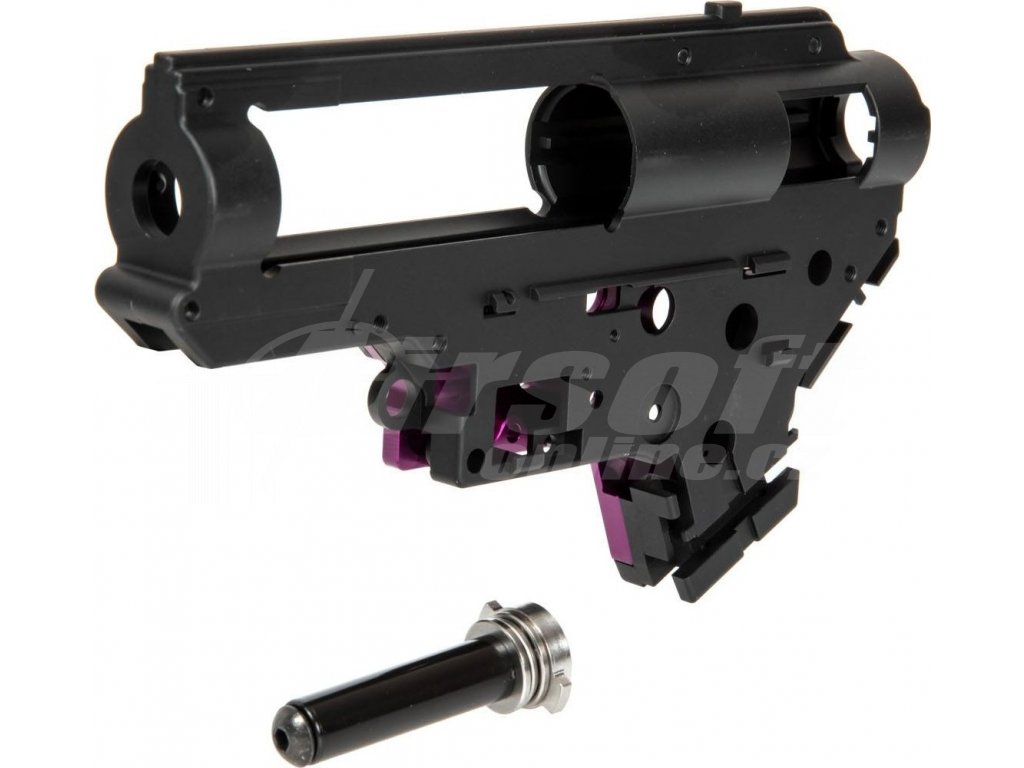 Nejkvalitnější rám převodovky z hliníku určený pro montáž do replik převodovek V2. Rám má pouzdra pro ložiska 8 mm. Sada obsahuje montážní šrouby a speciální vedení pružiny s kuličkovým ložiskem. Materiály použité při výrobě umožňují vytvoření jedinečné repliky AEG připravené na tuning.