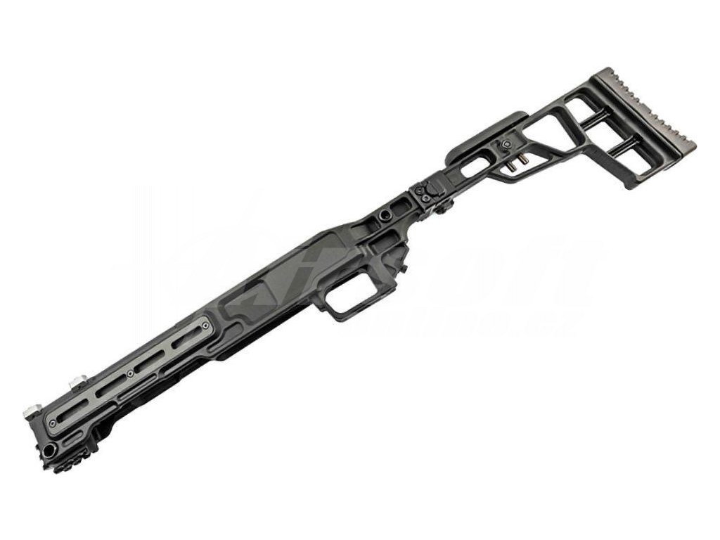 Šasi je vyrobeno převážně z vysoce kvalitního polymeru, který je odolný a lehký. Zároveň zde také najdete kovové díly pro větší podporu. Vzhledem k tomu, že je toto šasi vysoce modulární, může se tak pochlubit nejen kompatibilitou s M-LOK systémem, ale také nabízí sekce picatinny kolejnic na konkrétních místech pro montáž různých pažeb a dvojnožek. Pažba dodávaná s tělem je lehká, kompaktnmí a skládací. Přiložený lícní nástavec se snadno nastavuje a skládací mechanismus je vysoce robustní, takže je skvělým vylepšením pro každého airsoftového odstřelovače.