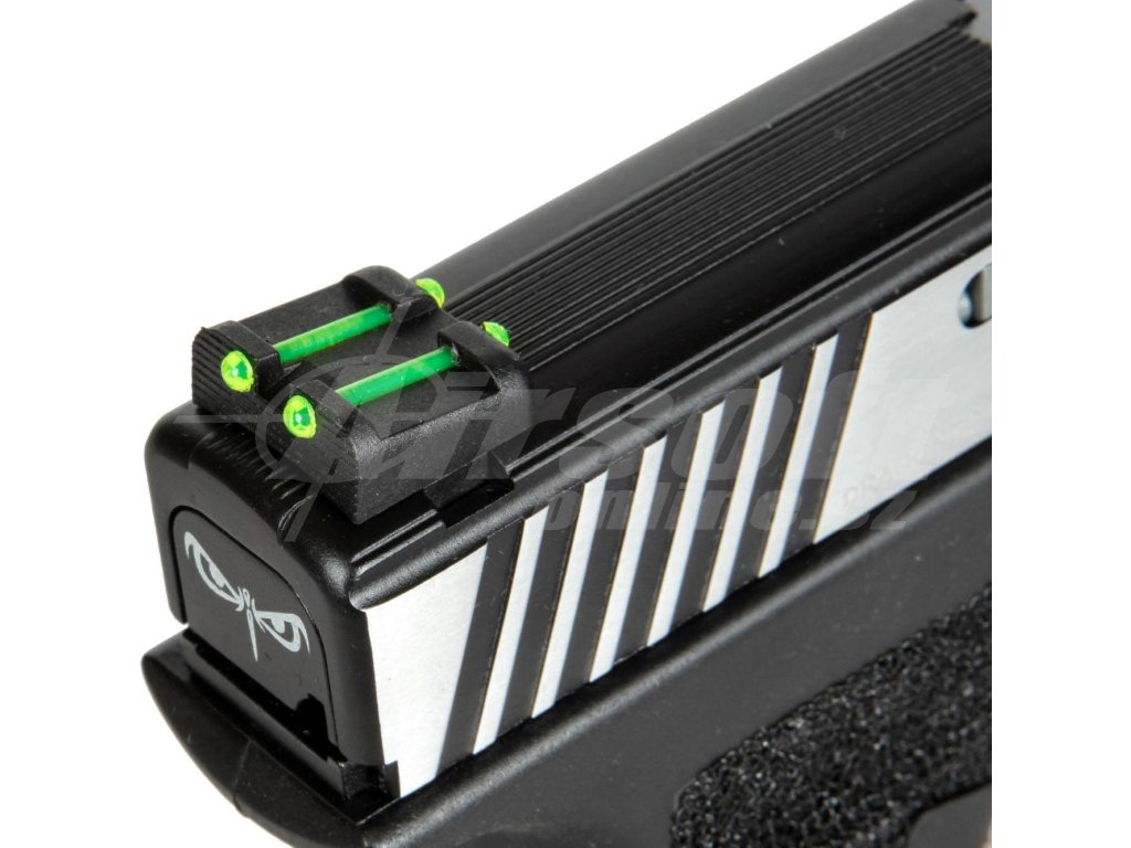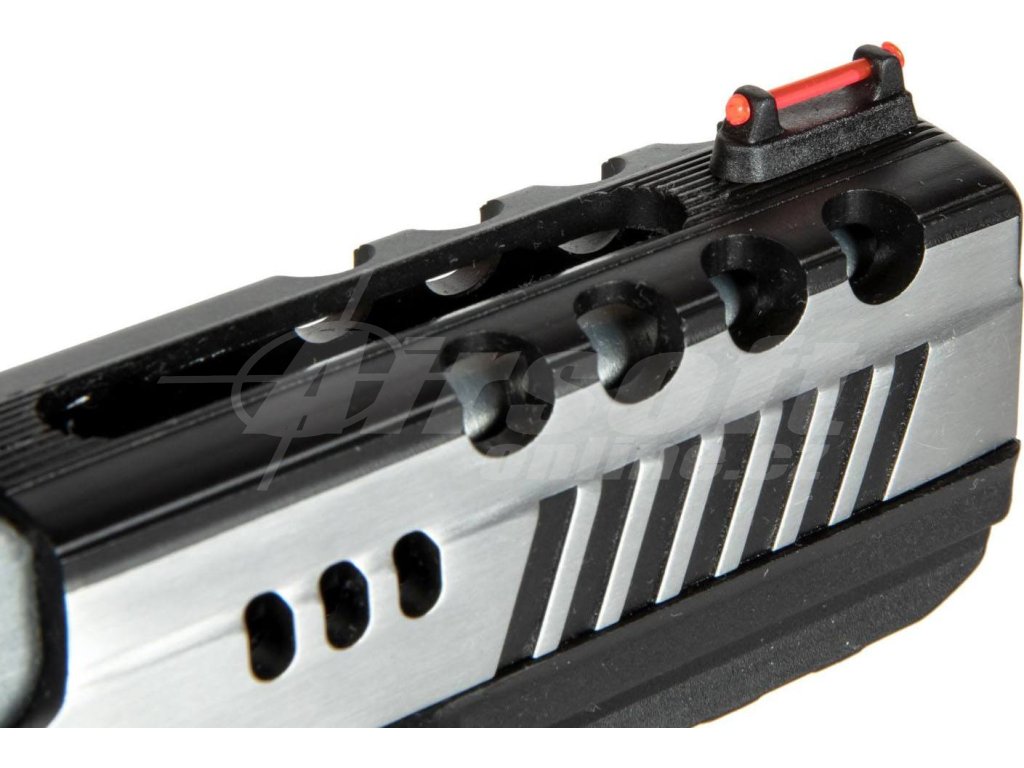 - Odlehčený kovový závěr: Stříbrný závěr s výřezy nejenže zlepšuje estetiku zbraně, ale také snižuje hmotnost a zvyšuje rychlost pohybu závěru při střelbě.