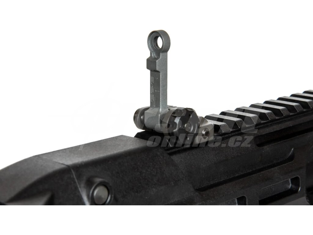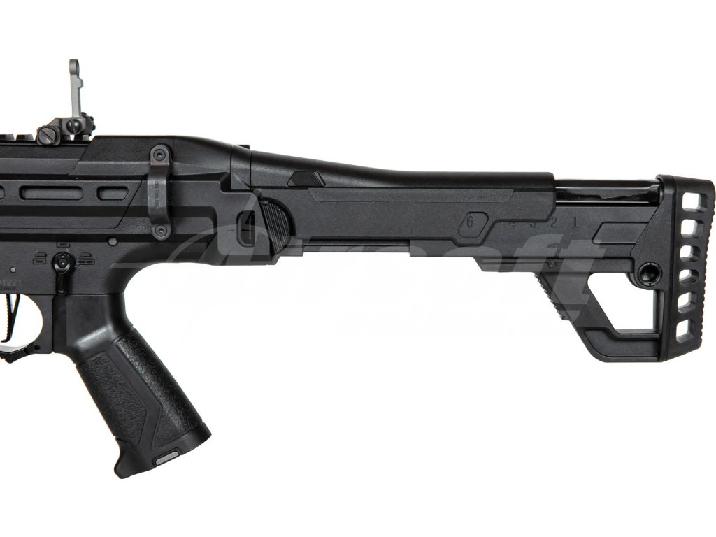 Zbraň dosahuje úsťové rychlosti až 115 m/s (377 FPS), což při použití 0,25g kuliček znamená spolehlivý dostřel přes 50 metrů. Celková délka je nastavitelná mezi 423 a 665 mm díky výsuvné pažbě, která je navíc sklopná pro snadnější přepravu. Polymerové tělo s kovovým M-LOK předpažbím je pevné a zároveň velmi lehké, což oceníte při delších hrách i v CQB prostředí.