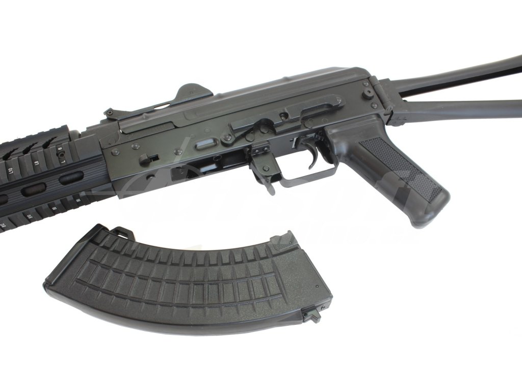 Replika je konstruována s důrazem na detail a odolnost. Tělo i pažba jsou vyrobeny z oceli, sváry jsou přesné a pevné. Model je vybaven sklopnou rámovou pažbou a kovovým předpažbím s R.I.S. montážemi na čtyřech stranách, které umožňují snadné uchycení kolimátorů, svítilen, rukojetí nebo dalšího taktického příslušenství. Na levé straně se nachází boční lišta pro montáž optiky určené pro platformu AK. To vše činí ze zbraně ideální volbu jak pro klasický boj, tak pro specializované CQB scénáře.