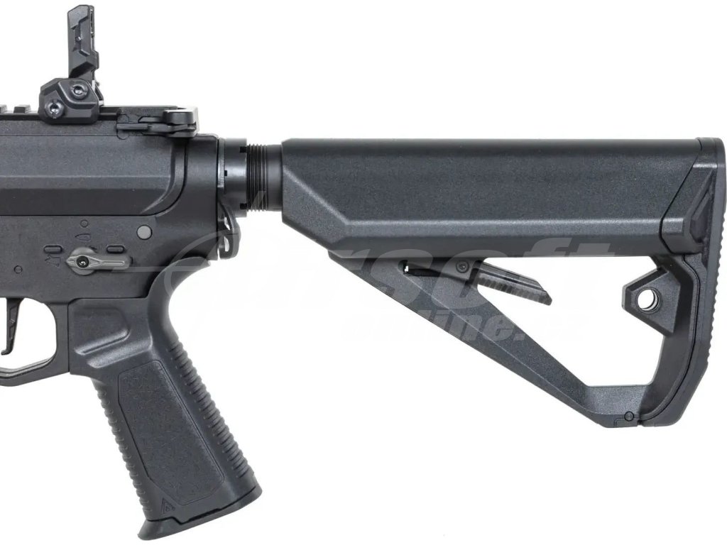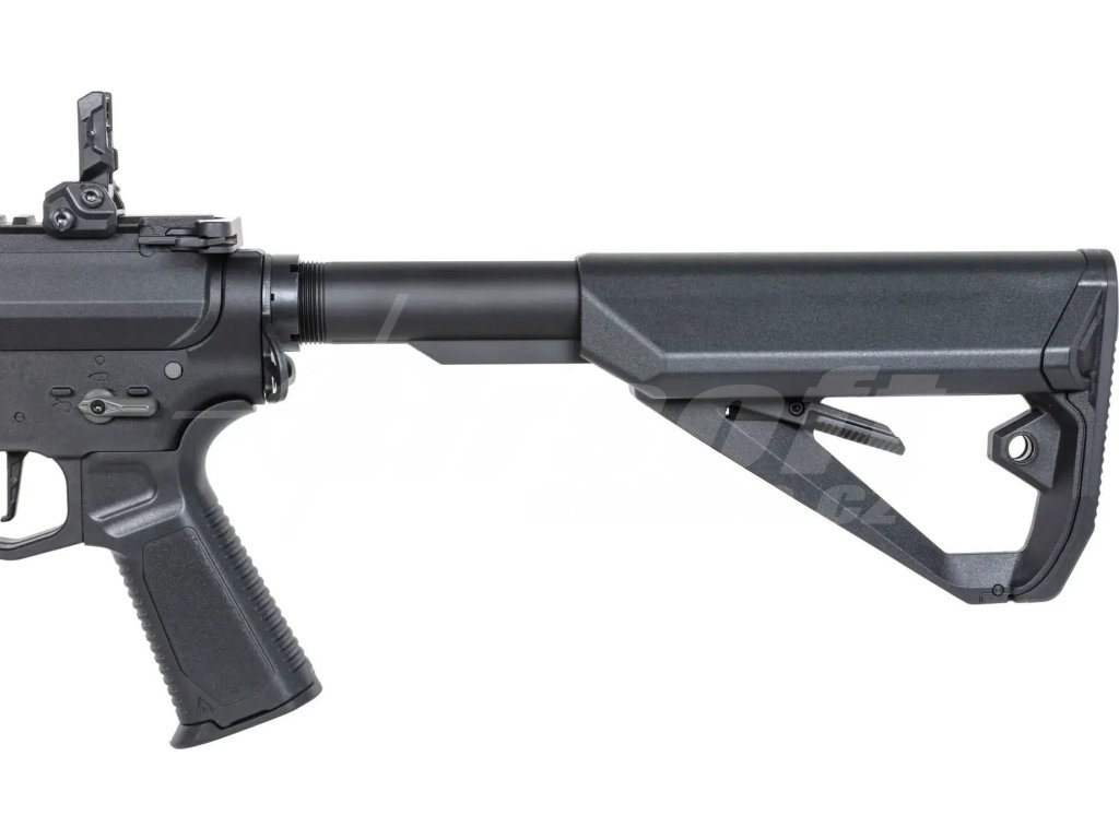 Konstrukce této repliky kombinuje pevné polymerové tělo z nylonu PA66 vyztuženého skelnými vlákny s precizními kovovými komponenty. Ocelové části zahrnují montážní kroužky, montáž popruhu, šrouby a QD úchyty, zatímco hliníkové jsou ovládací prvky (záchyt závěru, zásobníku, volič režimu), předpažbí M-LOK 9,6”, RIS lišta a flash hider. Výsledkem je nízká hmotnost, ale velmi vysoká pevnost a odolnost. Ergonomická pistolová rukojeť se zdrsněním, taktická výsuvná pažba a výborně vyvážená stavba dělají ze zbraně nástroj připravený na rychlou akci.