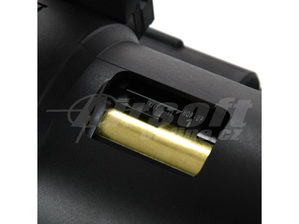 ❗ Při seřizování hop-upu vždy začněte s jeho úplně uvolněným (vypnutým) nastavením. Poté vystřelte několik kuliček a mírně dotáhněte přítlak. Tento krok opakujte, dokud nedosáhnete ideálního Hop-Up efektu. Přílišné utažení Hop-Upu může způsobit zadušení zbraně a v extrémním případě poškodit její vnitřní součásti (kola, píst aj.).