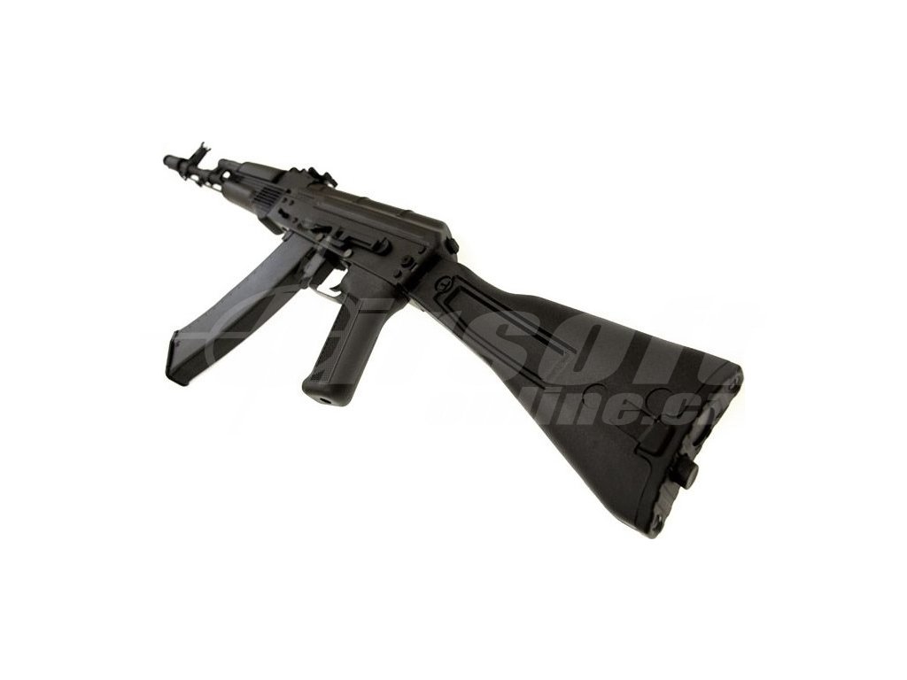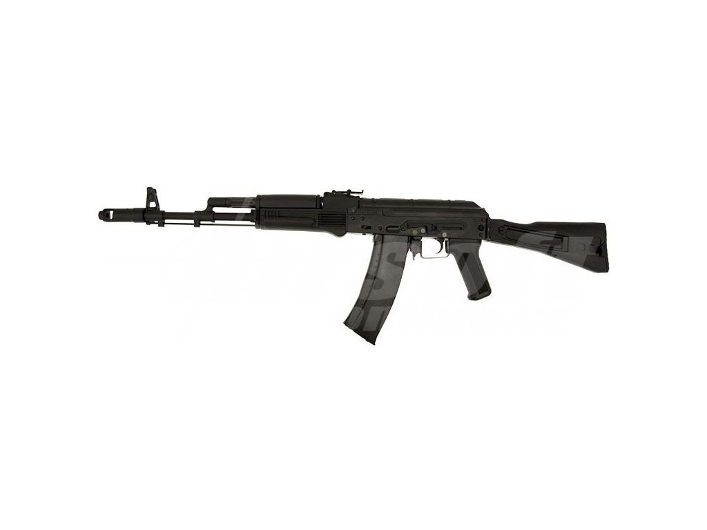 Replika modelu AK-74M - ocel [BY-005/RK-05] s ocelovým tělem, krytem závěru, kompenzátorem na ústí hlavně a sklopnou pažbou. Stavitelná mířidla, hlaveň, úchyt na popruh, lučík a další dílky jsou také kovové. Pažba a předpažbí jsou velice zdařile vyrobené z pravého dřeva. Na levé straně těla je boční montážní lišta, pomocí které lze na zbraň snadno nasunout boční bázi AK s optikou nebo kolimátorem.